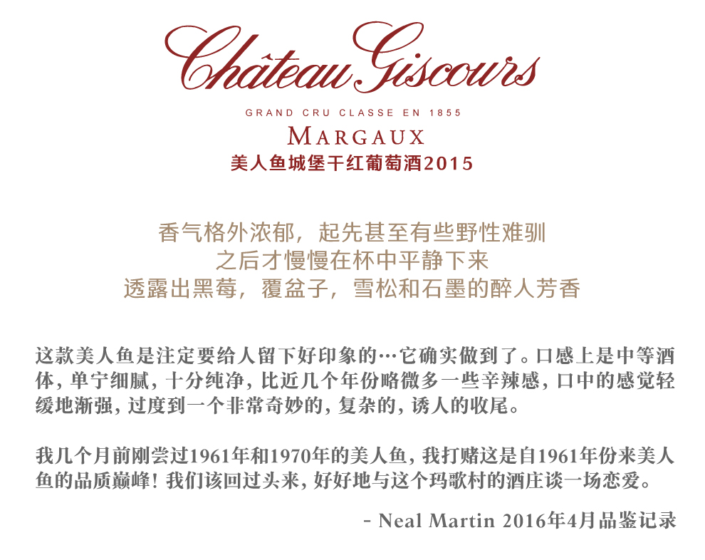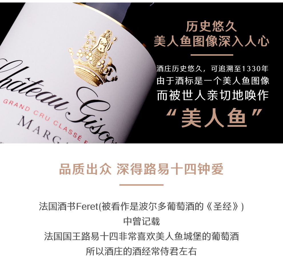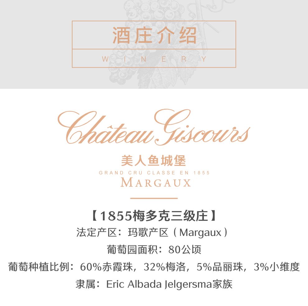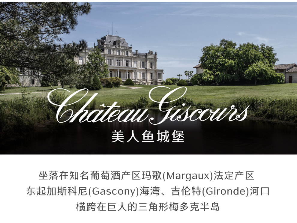 美人鱼城堡(Chateau Giscours)在1855年梅多克评级中被评为三级酒庄,因酒庄的酒标是一个美人鱼图像而被世人亲切地唤作“美人鱼”。美人鱼城堡坐落在世界顶级葡萄酒产区玛歌(Margaux),是梅多克产区最大的酒庄之一,也是波尔多产区最大的酒庄之一,距离波尔多西北部20公里,东起加斯科尼(Gascony)海湾、吉伦特(Gironde)河口,横跨在巨大的三角形梅多克半岛。