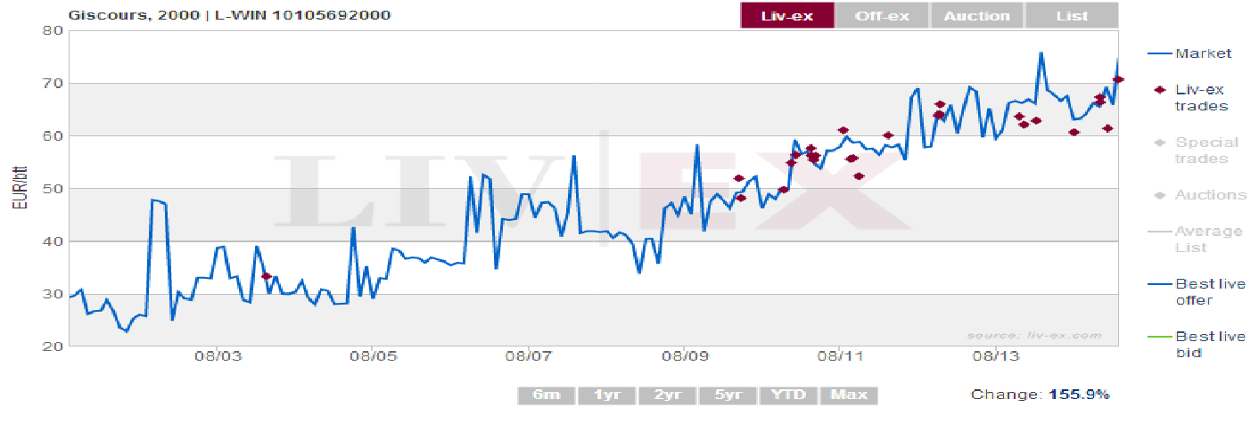 如今,较老年份的葡萄酒已经显示出了巨大的升值潜力了。当年发布价格为每瓶19欧元的2000年美人鱼,如今已可以卖到73欧元,涨幅达210%。Liv-ex数据显示,一箱2000年份的美人鱼目前的市场价格为618英镑。