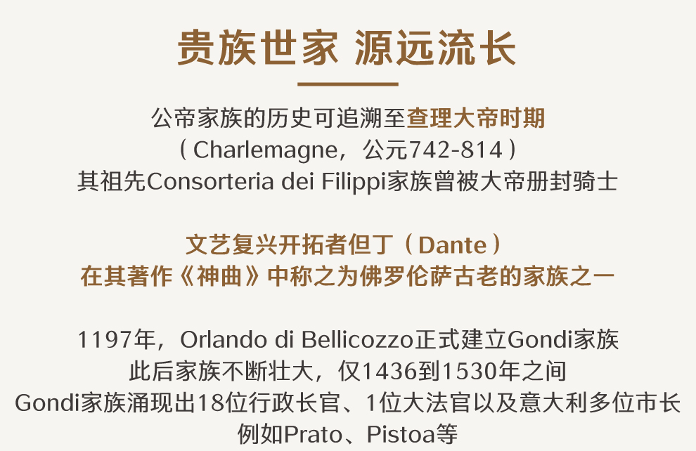 1197年,佛罗伦萨的Orlando di Bellicozzo正式建立家族,家族名称Gondi源于他的一位曾孙:Gondo di Ricovero。家族不断壮大,1436到1530年之间,Gondi家族涌现出18位行政长官,一位杰出的大法官,以及意大利各大城市的市长,例如普拉托(Prato)、皮斯托亚(Pistoa)等。