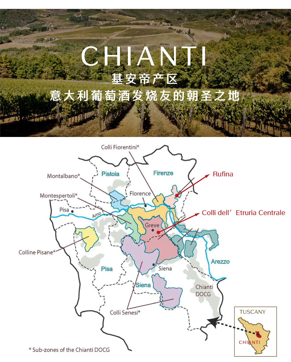 这个以红葡萄酒为主的产区共有11种DOCG和34种DOC葡萄酒,而且其中的大多数都拥有卓越的名声。著名的DOCG包括经典基安帝(Chianti Classico)、基安帝(Chianti)和布鲁奈罗蒙塔希诺(Brunello di Montalcino)。值得注意的是,经典基安帝的生产者组织成立了经典基安帝协会。加入这个协会的会员,其葡萄酒瓶身上会贴一个圆形标志,这个标志的中央绘有一只名为“Gallo Nero”的黑公鸡,在其下方写着“CHIANTI CLASSICO(经典基安帝)”字样。