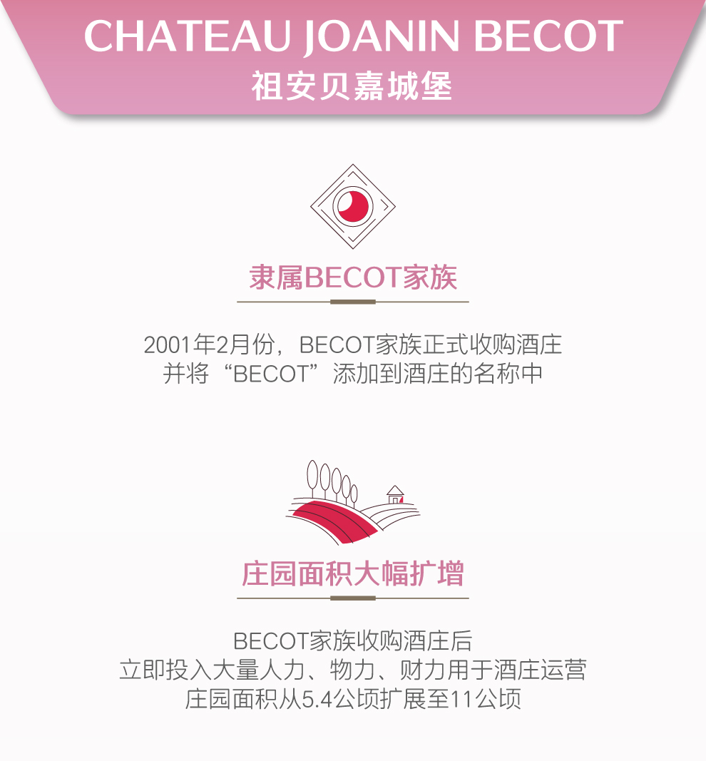 2001年2月份,Bécot家族于2001年2月购买了Joanin Becot城堡。Joanin Becot位于吉伦特省一些最高的海拔。购买房产后不久,家庭也把他们的名字也添加到了房产中。在购买的时候,Joanin Becot在2001年是5.4公顷。随着额外的采购,他们将葡萄园的面积扩大到了11公顷。