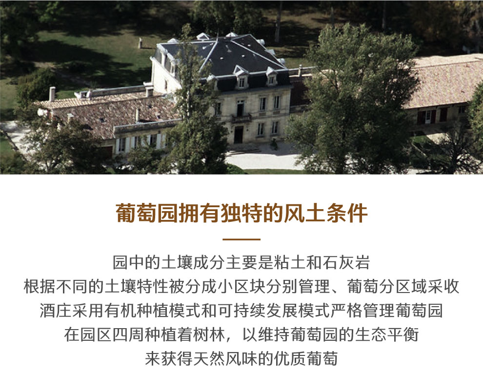 弗兰城堡的葡萄园始建于1976年,面积为35公顷。在葡萄园的四周环绕着树林,拥有独特的风土条件。园中的土壤成分主要是粘土和石灰岩,有利于种植多个葡萄品种。酒庄根据不同的土壤特性把葡萄园分成小区块分别管理,其中在葡萄园20%的区域种有长相思(Sauvignon Blanc)、赛美蓉(Semilllion)和密斯卡岱(Muscadelle)等白葡萄品种,而在剩余的区域则种有赤霞珠(Cabernet Sauvignon)、梅洛(Merlot)和品丽珠(Cabernet Franc)等红葡萄品种。酒庄采用有机种植模式和可持续发展模式严格管理葡萄园,最大限度地维持葡萄园的生态平衡,以获得天然风味物质浓郁的优质葡萄。