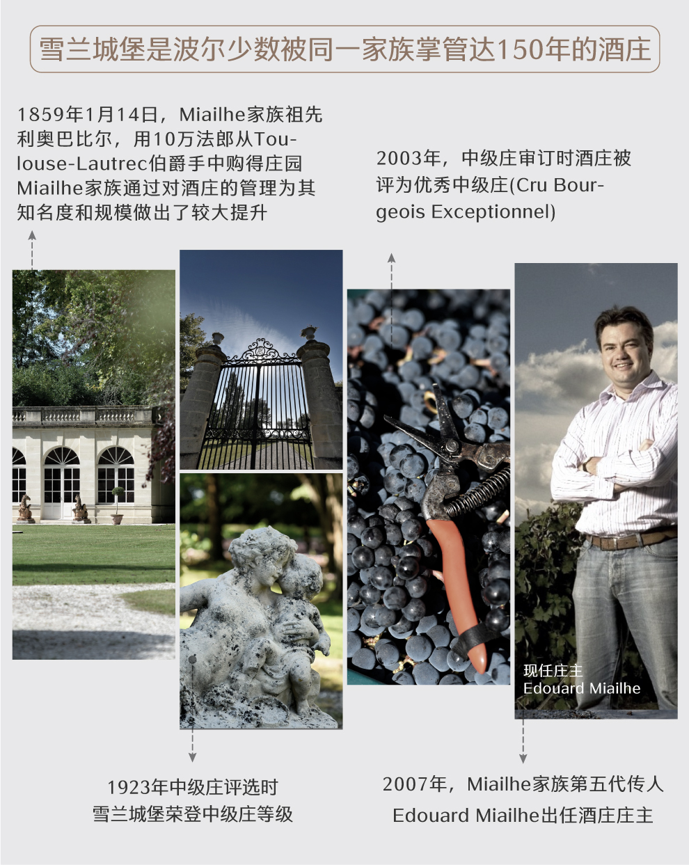 2007年,Miailhe 家族第五代传人Edouard Miailhe 接任酒庄庄主。自此,雪兰城堡是波尔多为数不多的被同一家族掌管达150年的酒庄。