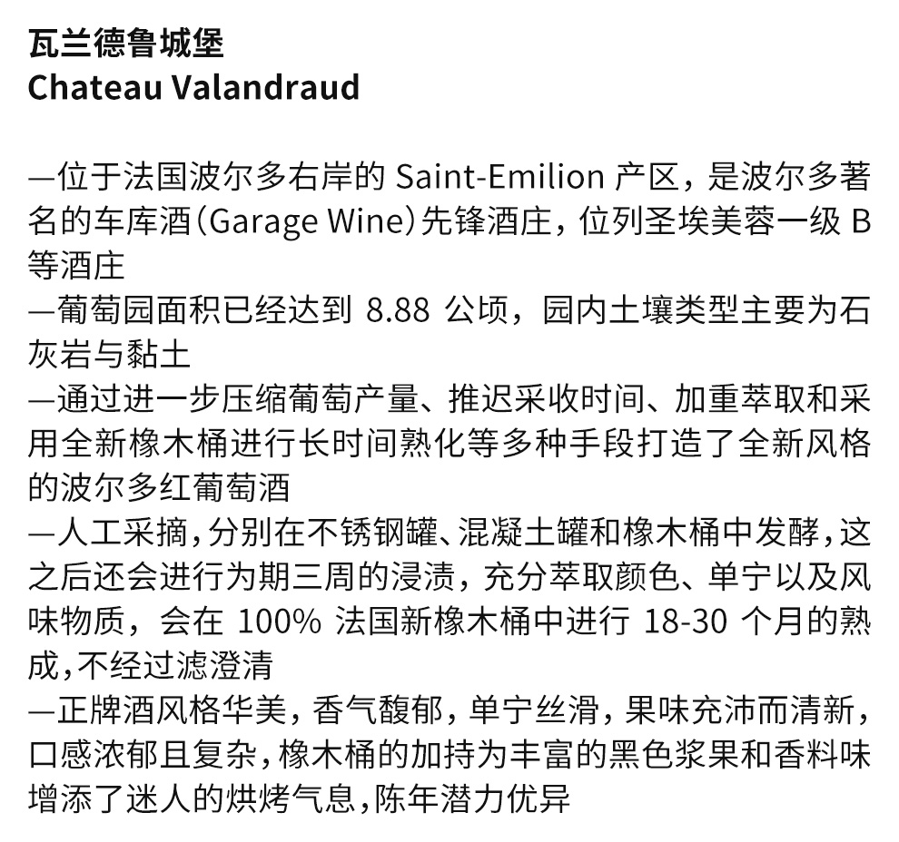 瓦兰德鲁城堡(Chateau Valandraud)位于法国波尔多右岸的圣爱美容地区,是波尔多右岸知名的车库酒庄。在十几年前几乎没有人知道瓦兰德鲁城堡,但现在这里出产的酒却是圣爱美容地区价格最高的酒。