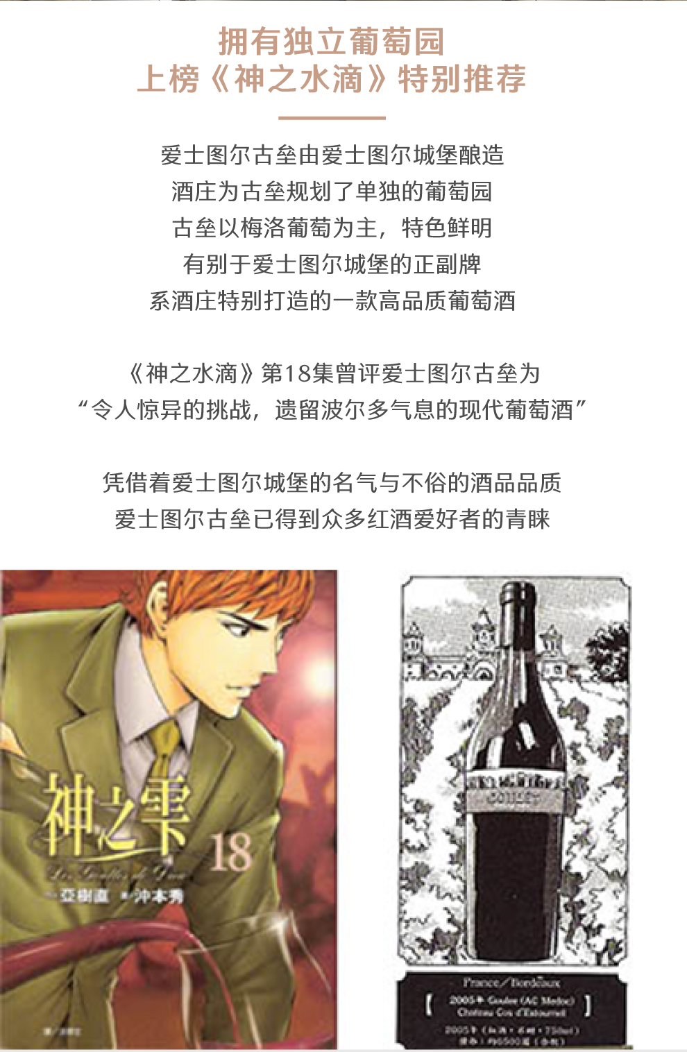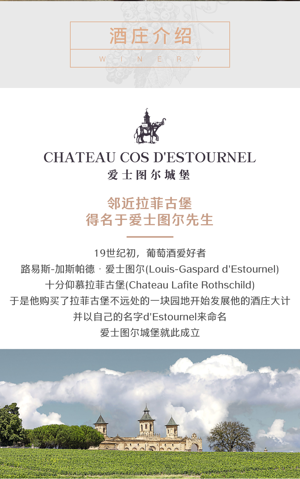 爱士图尔庄园闻名遐迩的城堡建筑同样出自创始人路易斯之手。对东方文化涉猎颇深且十分喜爱的路易斯别出心裁地将众多东方元素融合进酒庄城堡的设计中。他在酒庄城堡之上建造了雄伟的印度宝塔,宝塔之下则为华丽精美的酒窖,为爱士图尔庄园点缀上绮丽而沉静的东方色彩。此外,他还特意从桑给巴尔(Zanzibar)运回一道苏丹宫殿大门,并在城堡各处雕刻上象征着智慧的印度大象,将酒庄打造成“献给葡萄酒的一座豪华宫殿”,路易斯本人也因此被人们称为“圣埃斯泰夫大君(Maharajah of Saint-Estephe)”。如今,爱士图尔这座独具东方古韵的城堡已成为波尔多最热门的景点之一。
