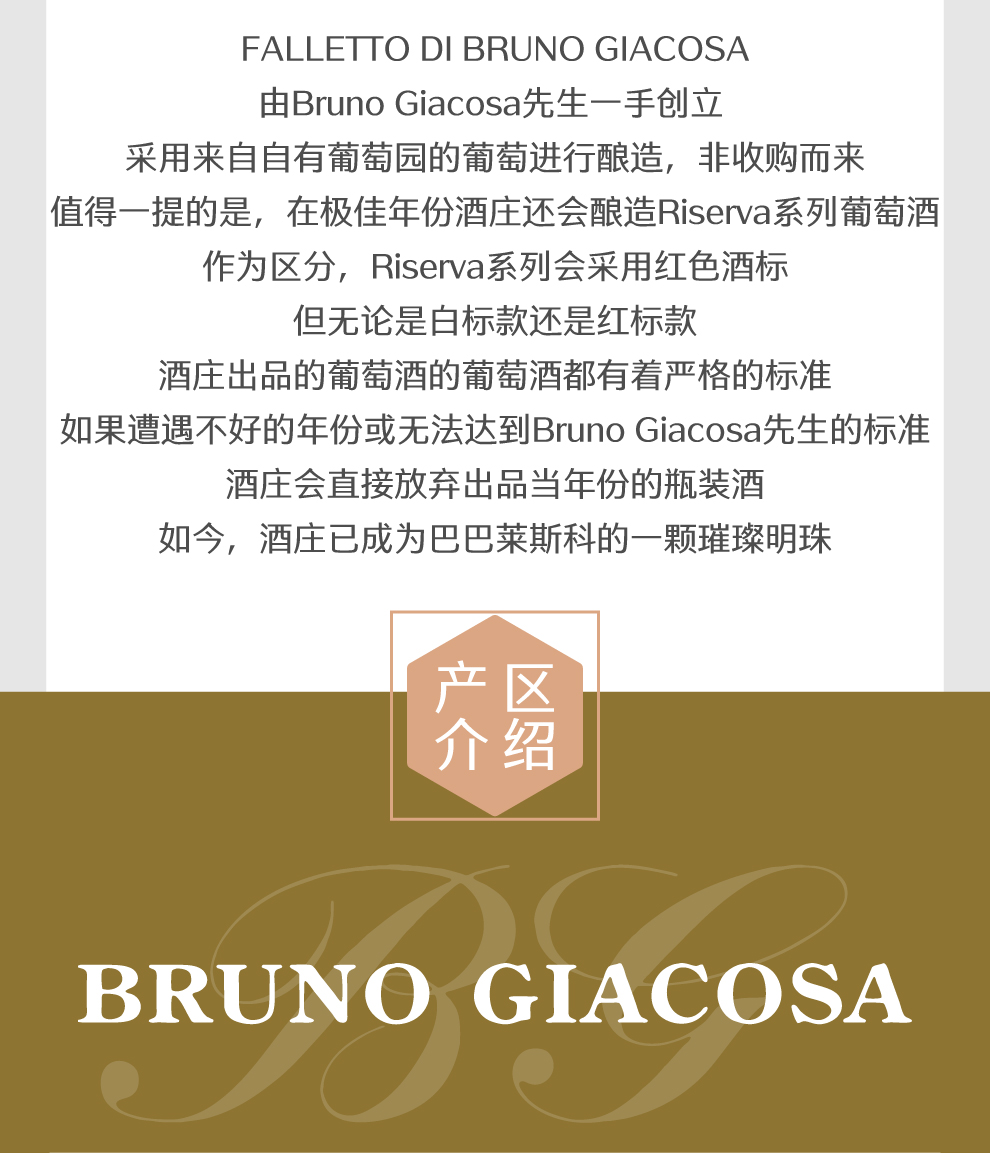 FALLETTO DI BRUNO GIACOSA由Bruno Giacosa先生一手创立 。采用来自自有葡萄园的葡萄进行酿造,非收购而来,值得一提的是,在极佳年份酒庄还会酿造Riserva系列葡萄酒