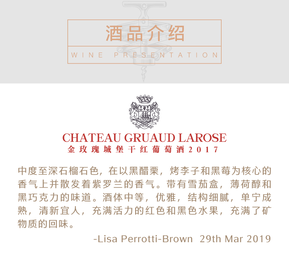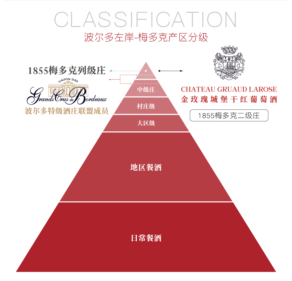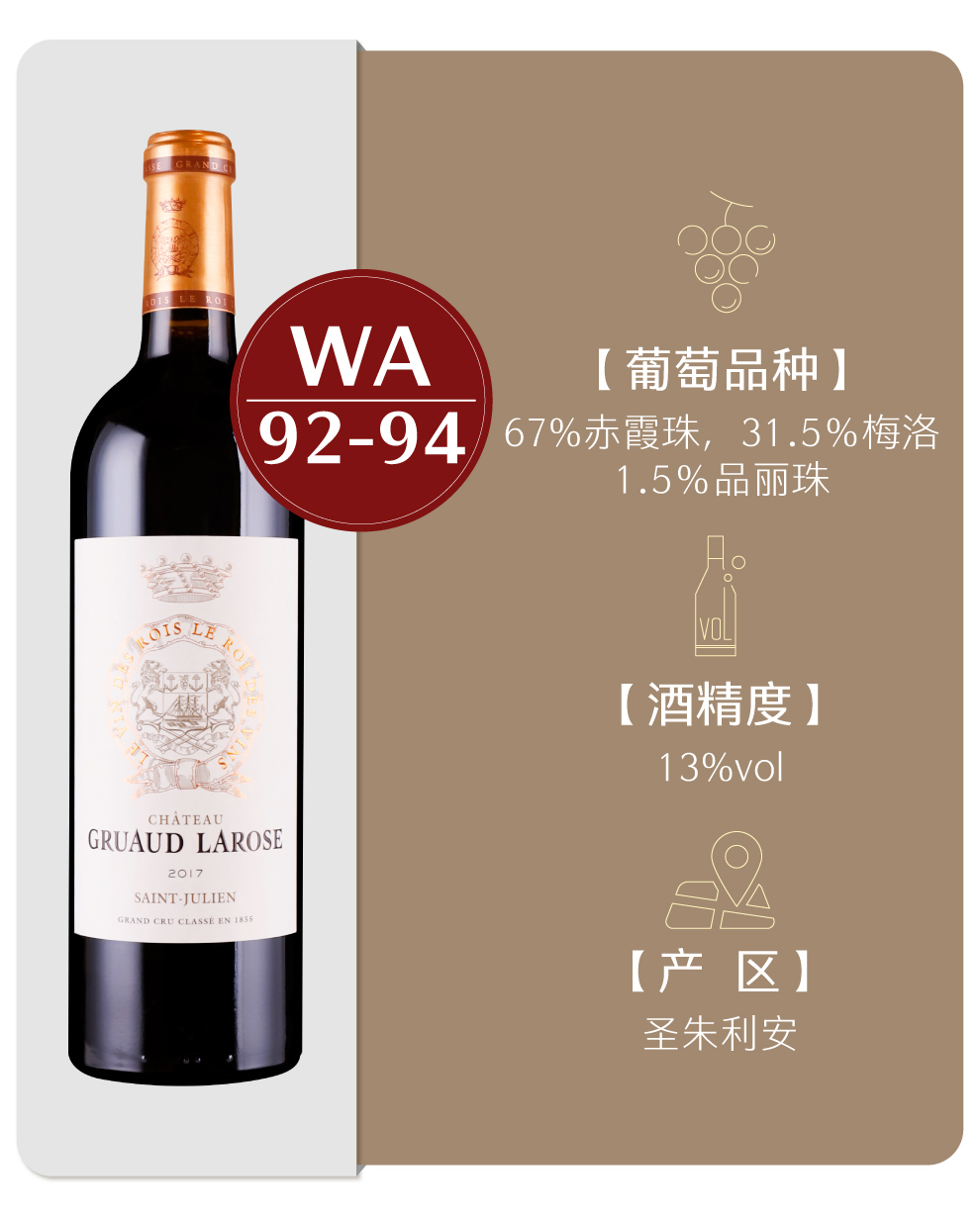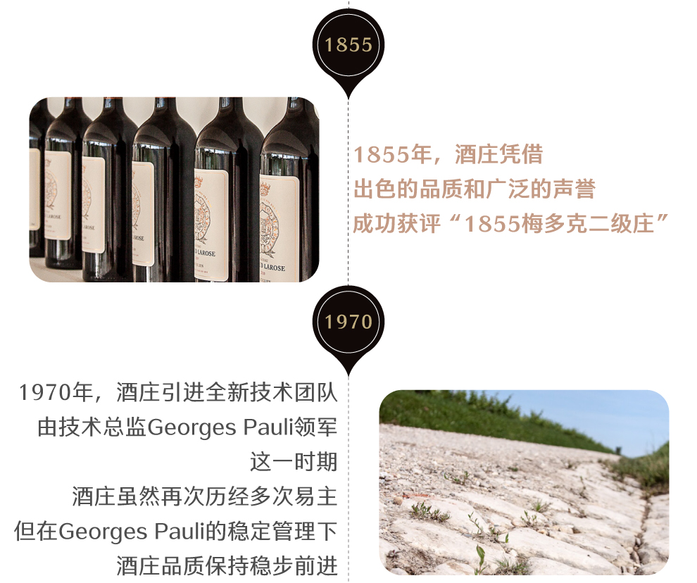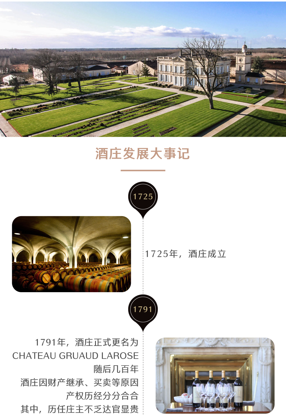 1855年梅多克分级二级庄Chateau Gruaud Larose位于波尔多左岸Saint Julien, 城堡于1725年建立, 而1791年时才正式有了Gruaud Larose这个名字, 几百年来因财产继承以及买卖等过程, 城堡所有权分分合合, 1917年Cordier家族先买下当时一分为二的Chateau Gruaud Larose其中一半的所有权-Gruaud Larose Sarget, 并于1935买下另一半Gruaud Larose Bethmann, 直到此时Chateau Gruaud Larose终于结束百多年来的分裂, 在Cordier家族的致力经营之下, 也出现了极为精采的1961年份, 以及1962, 1966, 1970年等佳酿。1970年开始酒庄引进新的技术团队, 由技术总监Georges Pauli领军, 1983年苏伊士Suez集团入主, 1993年又转手到艾卡特·艾斯森Alcatel Alsthom集团旗下, 引进计算机管理以及许多新科技, 并扩大厂房及更新酒窖设备, 使Chateau Gruaud Larose更为现代化, 1997年Merlaut家族入主, 现今庄主为Jean Merlaut, 1970年代开始虽然酒庄数度易主, 但仍由Georges Pauli执掌的技术团队负责酿酒。