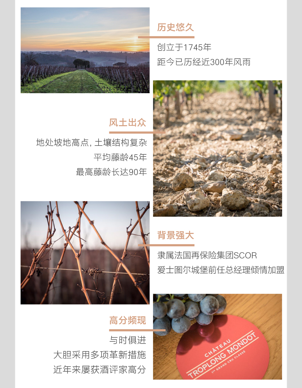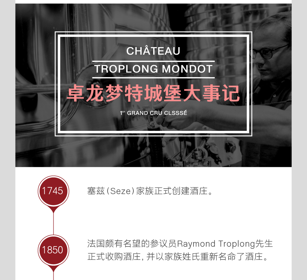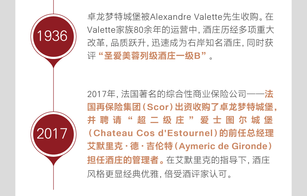1850年,法国颇有名望的参议员雷蒙·卓龙(Raymond Troplong)先生购下卓龙梦特城堡。在其掌管期间,酒庄的葡萄园面积逐步扩张至如今的规模,酒庄名字中的“卓龙(Troplong)”便是来自这位庄主。此后,酒庄历经两次转手,于1936年迎来第四任主人亚历山大·瓦莱特(Alexandre Valette)先生。接下来的80余年里,卓龙梦特城堡一直为瓦莱特(Valette)家族所有。在瓦莱特家族的历任掌门人中,克里斯汀·瓦莱特-帕瑞特(Christine Valette-Pariente)是贡献最大的管理者之一。克里斯汀于20世纪80年代初接管酒庄后,便大刀阔斧地开展了一番改革:实现人工采收;拔除此前栽种的马尔贝克(Malbec)葡萄树;推迟葡萄采收时间并降低葡萄产量,以增加最终成酒的集中度等。而在酒窖中,酿酒葡萄的筛选分拣过程变得更为严格;在酿酒容器中加入温控系统;在葡萄酒的陈酿过程中增加新法国橡木桶的比例等。这一系列举措成效卓著,使卓龙梦特城堡葡萄酒的品质日益上升,而卓龙梦特城堡也迅速成为波尔多右岸的知名酒庄。