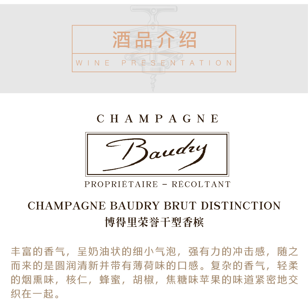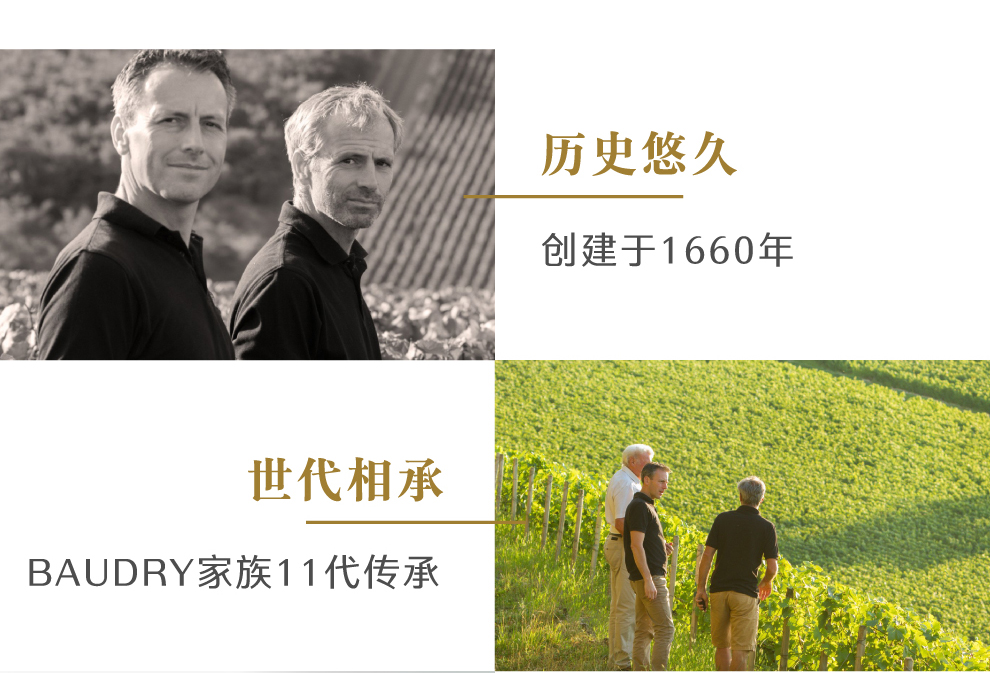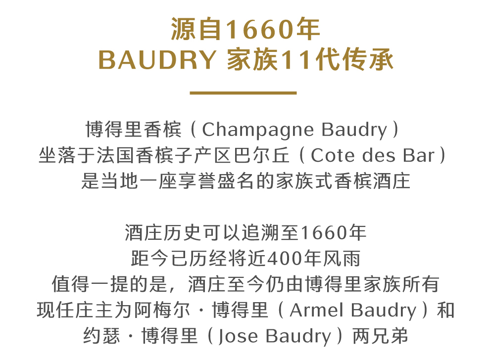 博得里香槟始创于1660年,为博得里家族(Baudry Family)所有,是巴尔丘当地一座历史十分悠久的酒庄。数百年来,博得里香槟坚持认真用心和追求优质的酿酒理念,将酒庄的优秀酿造技艺代代相传,现已传承至家族的第11代成员。作为博得里香槟的现任庄主,阿梅尔·博得里(Armel Baudry)和约瑟·博得里(Jose Baudry)兄弟两人将可持续发展的生态种植理念纳入酒庄的经营管理中,酒庄也得到了Terra Vitis生态种植协会的认证。