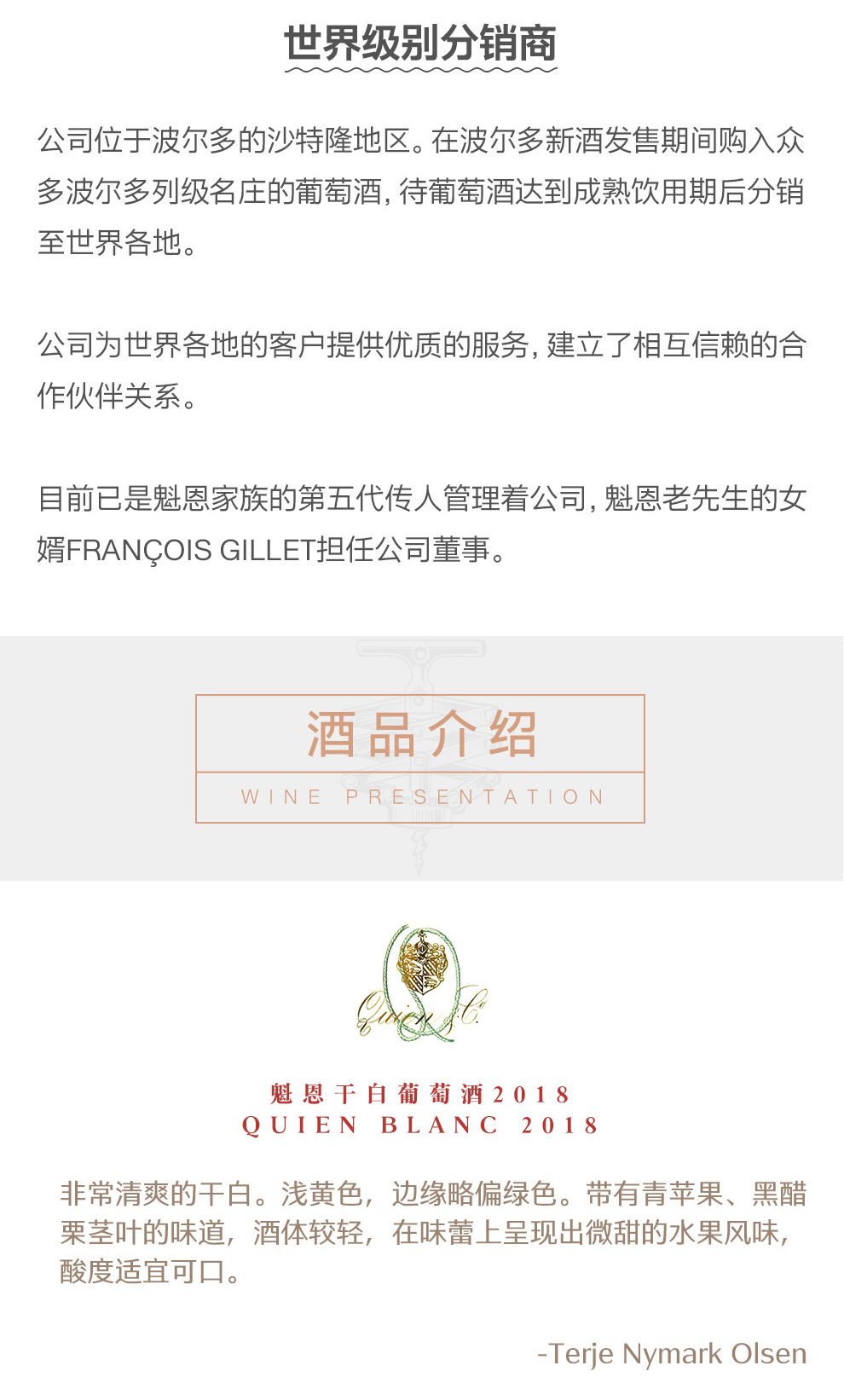 目前已是魁恩家族的第五代传人管理着公司,魁恩老先生的女婿FRANÇOIS GILLET担任公司董事。