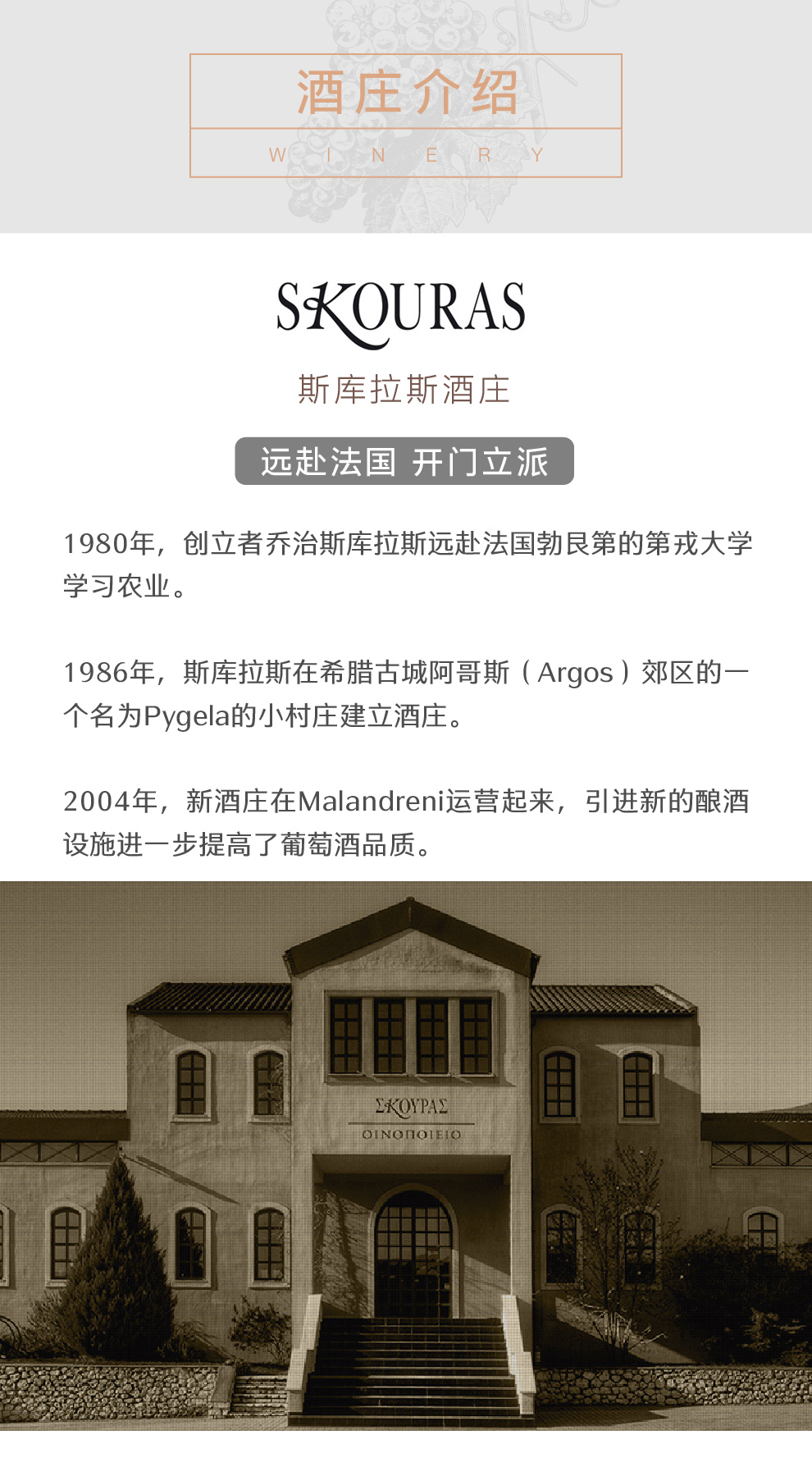 斯库拉斯酒庄(Domaine Skouras)创立于1986年。最初,小型酿酒厂位于希腊的古城阿哥斯(Argos)郊区的一个名为Pyrgela的小村庄。2004年,新酒庄在Malandreni运营起来,新的设施也提高了生产力和葡萄酒品质。