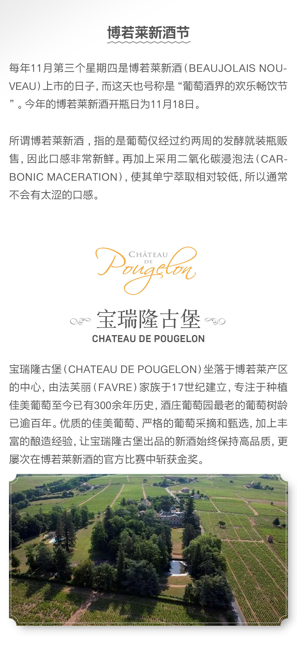 宝瑞隆古堡(Chateau de Pougelon)坐落于博若莱产区的中心,由法芙丽(Favre)家族于17世纪建立,专注于种植佳美葡萄至今已有300余年历史,酒庄葡萄园最老的葡萄树龄已逾百年。优质的佳美葡萄、严格的葡萄采摘和甄选,加上丰富的酿造经验,让宝瑞隆古堡出品的新酒始终保持高品质,更屡次在博若莱新酒的官方比赛中斩获金奖。