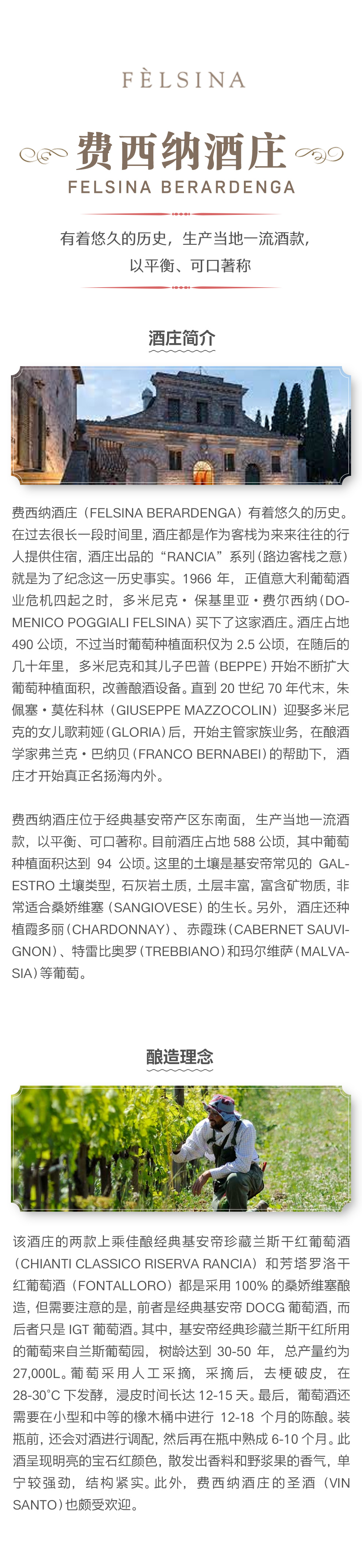 该酒庄的两款上乘佳酿经典基安帝珍藏兰斯干红葡萄酒(Chianti Classico Riserva Rancia)和芳塔罗洛干红葡萄酒(Fontalloro)都是采用100%的桑娇维塞酿造的,但需要注意的是,前者是经典基安帝DOCG葡萄酒,而后者只是IGT葡萄酒。其中,基安帝经典珍藏兰斯干红所用的葡萄来自兰斯葡萄园,树龄达到30-50年,总产量约为27,000L。葡萄采用人工采摘,采摘后,去梗破皮,在28-30°C下发酵,浸皮时间长达12-15天。最后,葡萄酒还需要在小型和中等的橡木桶中进行12-18个月的陈酿。装瓶前,还会对酒进行调配,然后再在瓶中熟成6-10个月。此酒呈现明亮的宝石红颜色,散发出香料和野浆果的香气,单宁较强劲,结构紧实。此外,费西纳酒庄的圣酒(Vin Santo)也是相当不错的。
