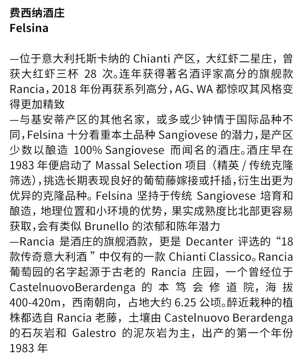 费西纳酒庄(Felsina Berardenga)有着悠久的历史。在过去很长一段时间里,酒庄都是作为客栈为来来往往的行人提供住宿,店中的名酒“Rancia”(译为“兰斯”,路边客栈之义)就是为了纪念这一历史事实的。1966年,正值意大利葡萄酒业危机四起之时,多米尼克• 保基里亚•费西纳(Domenico Poggiali Felsina)买下了这家酒庄。酒庄占地490公顷,不过当时葡萄种植面积仅为2.5公顷,在随后的几十年里,多米尼克和其儿子巴普(Beppe)开始不断扩大葡萄种植面积,改善酿酒设备。直到20世纪70年代末,朱佩塞•莫佐科林(Giuseppe Mazzocolin)迎娶多米尼克的女儿歌莉娅(Gloria)后,开始主管家族业务,在酿酒学家弗兰克•巴纳贝(Franco Bernabei)的帮助下,酒庄才开始真正名扬海内外。
