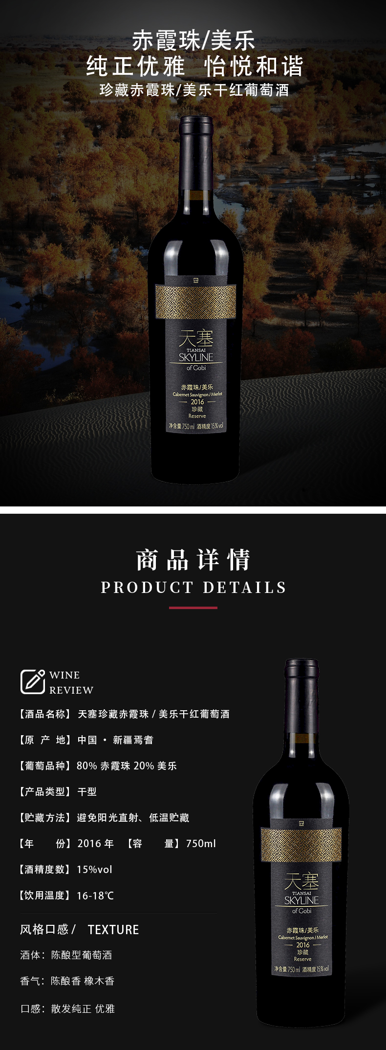 获得罗伯特帕克团队91分,IWC评委会主席、葡萄酒大师 安妮特·斯卡夫评价:珍藏赤霞珠/美乐和橡木桶结合较好,可能是因为赤霞珠更容易与橡木桶风味相结合,首位新加坡籍华裔葡萄酒大师、新加坡著名