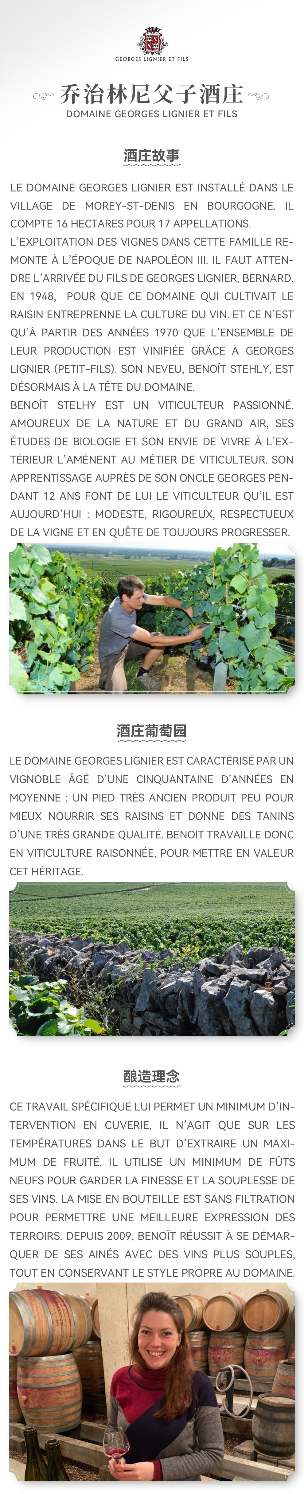 乔治林尼(Georges Lignier)家族种植葡萄的历史可以追溯到拿破仑三世时代。直到1949年Georges Lignier的儿子Bernard加入酒庄,和Georges一起管理葡萄园。也正是从这段时间开始,乔治林尼父子酒庄开始集中精力酿造属于自己家族品牌的葡萄酒。1970年,家族的所有酒品都在Bernard的儿子小乔治的经营下得以酿造,小乔治为酒庄制定了完整的葡萄酒酿造体系,并且大大提高了酒庄的酿酒技术。小乔治的侄子Benoît Stehly在2002年完成他的酿酒学业后也成为了乔治林尼父子酒庄(Georges Lignier et Fils)的一员,现在是酒庄的负责人。Benoît在叔叔Georges的带领下,十二年的学徒生涯使他成为了今天的酒庄管理者:谦虚、严谨、尊重风土并始终寻求进步。Benoît的加入对团队来说意义重大,他以现代化的酿酒方式完美地结合了Georges的传统方法,他的酿造方式大大提高了葡萄酒品质和酒庄的知名度。