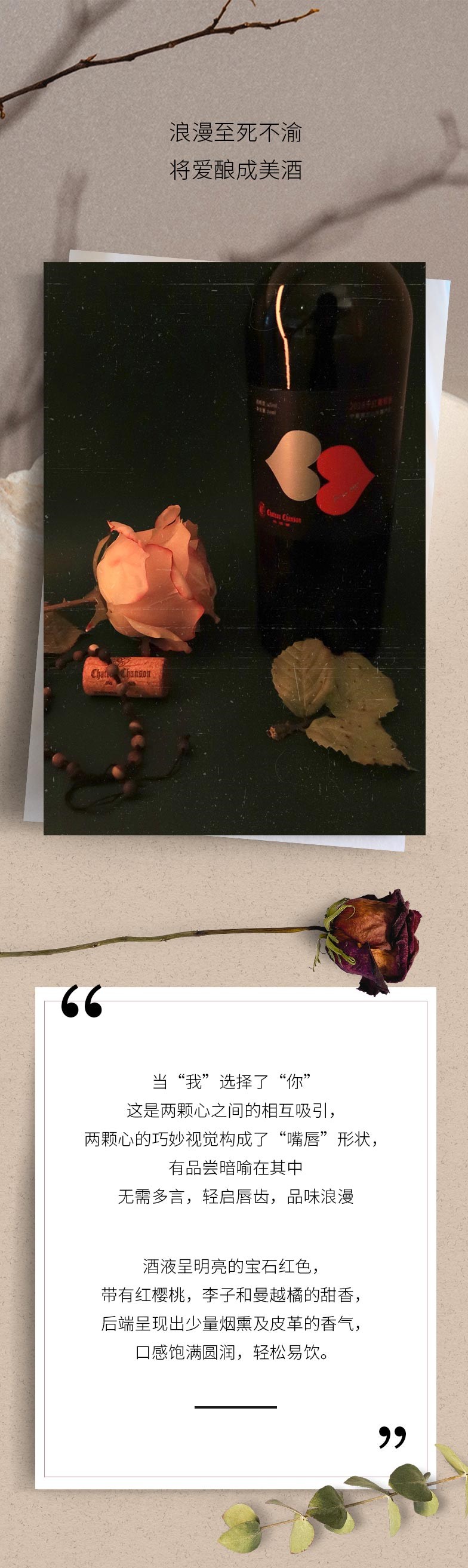 人工采收后逐粒精选,去梗破碎后使用气囊压榨机进行轻柔压榨,并采取冷浸渍的方式以保留醉新鲜的果香和醉活泼的酸度,随后在大的不锈钢桶内选用特定酵母进行温控发酵,并用旧的法国橡木桶熟成3个月。