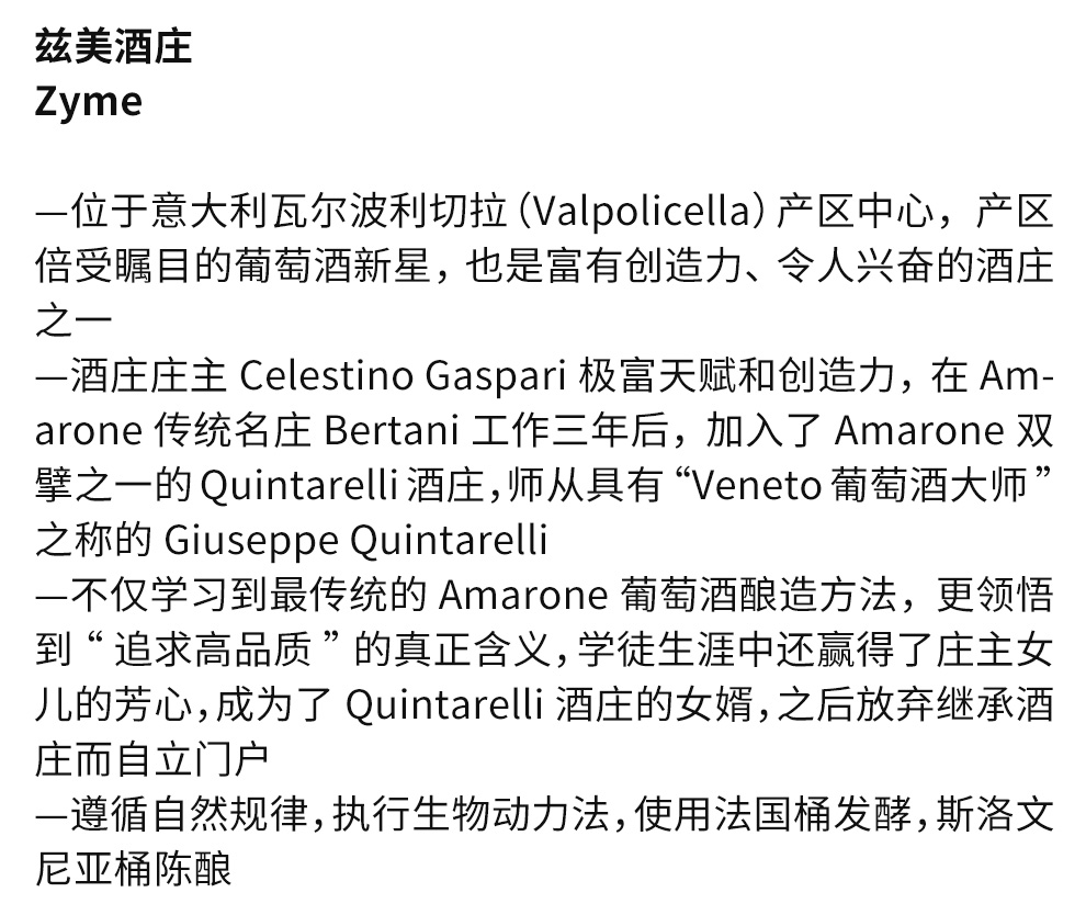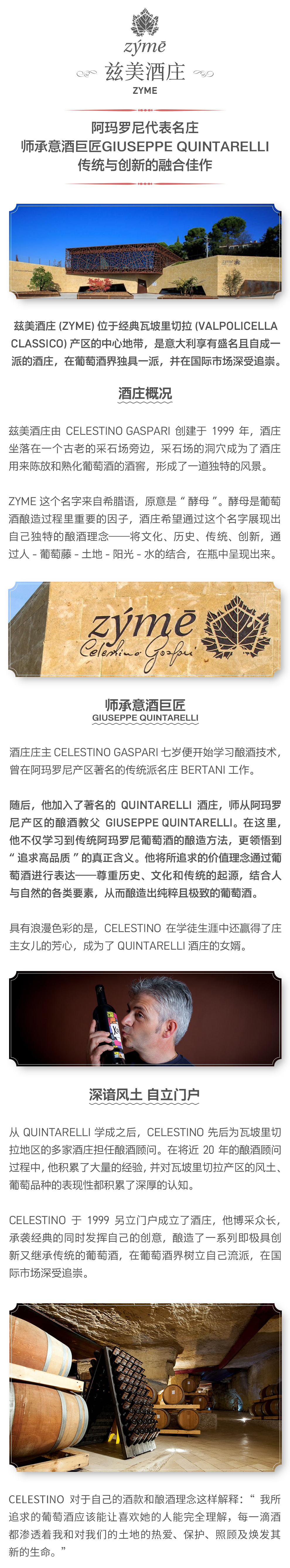 兹美酒庄(ZYME)位于经典瓦坡里切拉(Valpolicella Classico)产区的中心地带,是意大利享有盛名且自成一派的酒庄,在葡萄酒界独具一派,并在国际市场深受追崇。