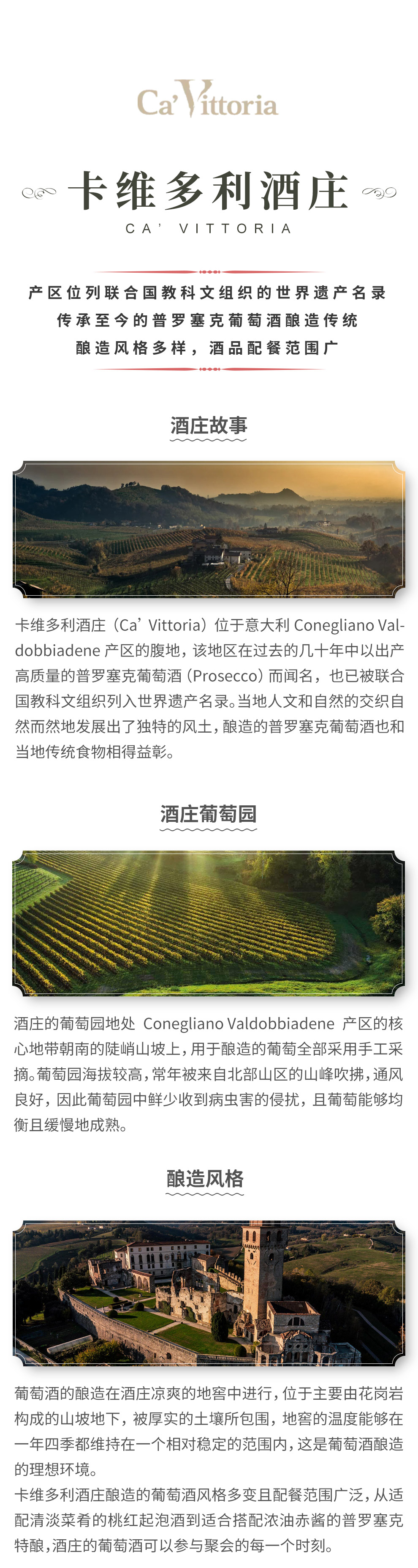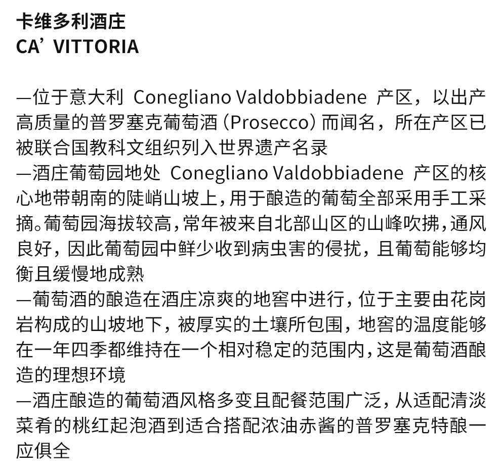 卡维多利酒庄(Ca’ Vittoria)位于意大利Conegliano Valdobbiadene产区的腹地,该地区在过去的几十年中以出产高质量的普罗塞克葡萄酒(Prosecco)而闻名,也已被联合国教科文组织列入世界遗产名录。当地人文和自然的交织自然而然地发展出了独特的风土,酿造的普罗塞克葡萄酒也和当地传统食物相得益彰。