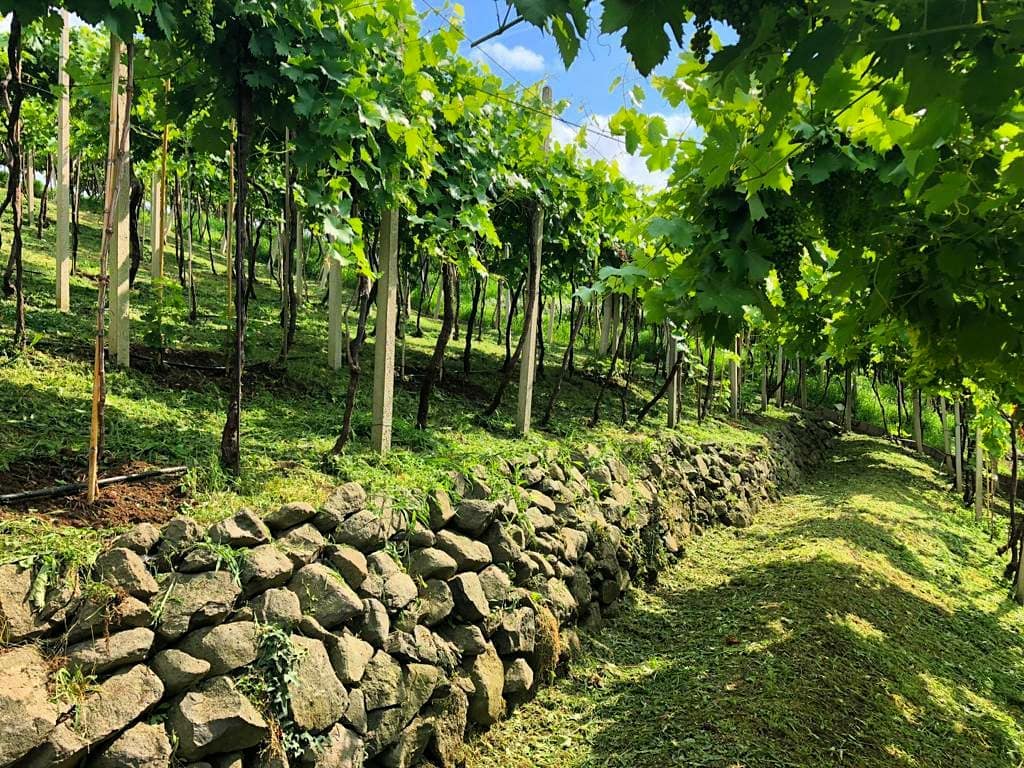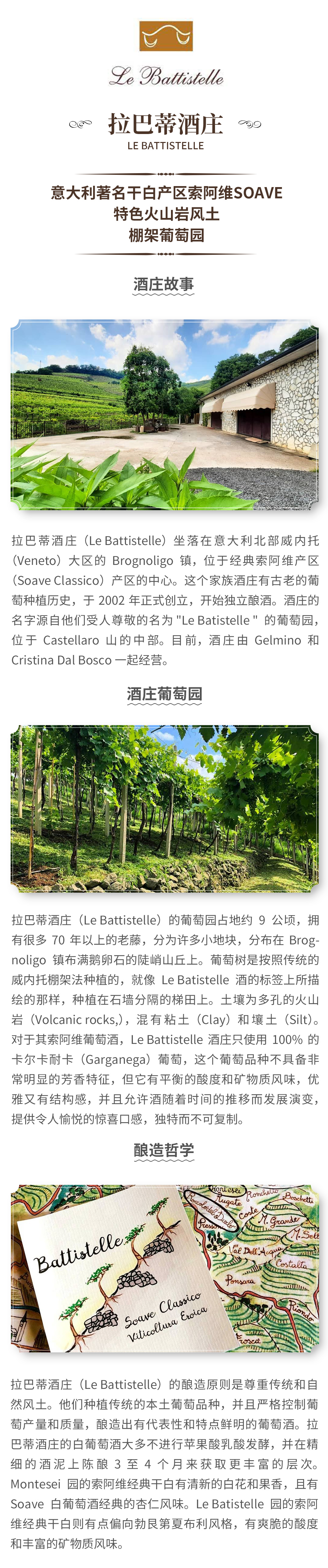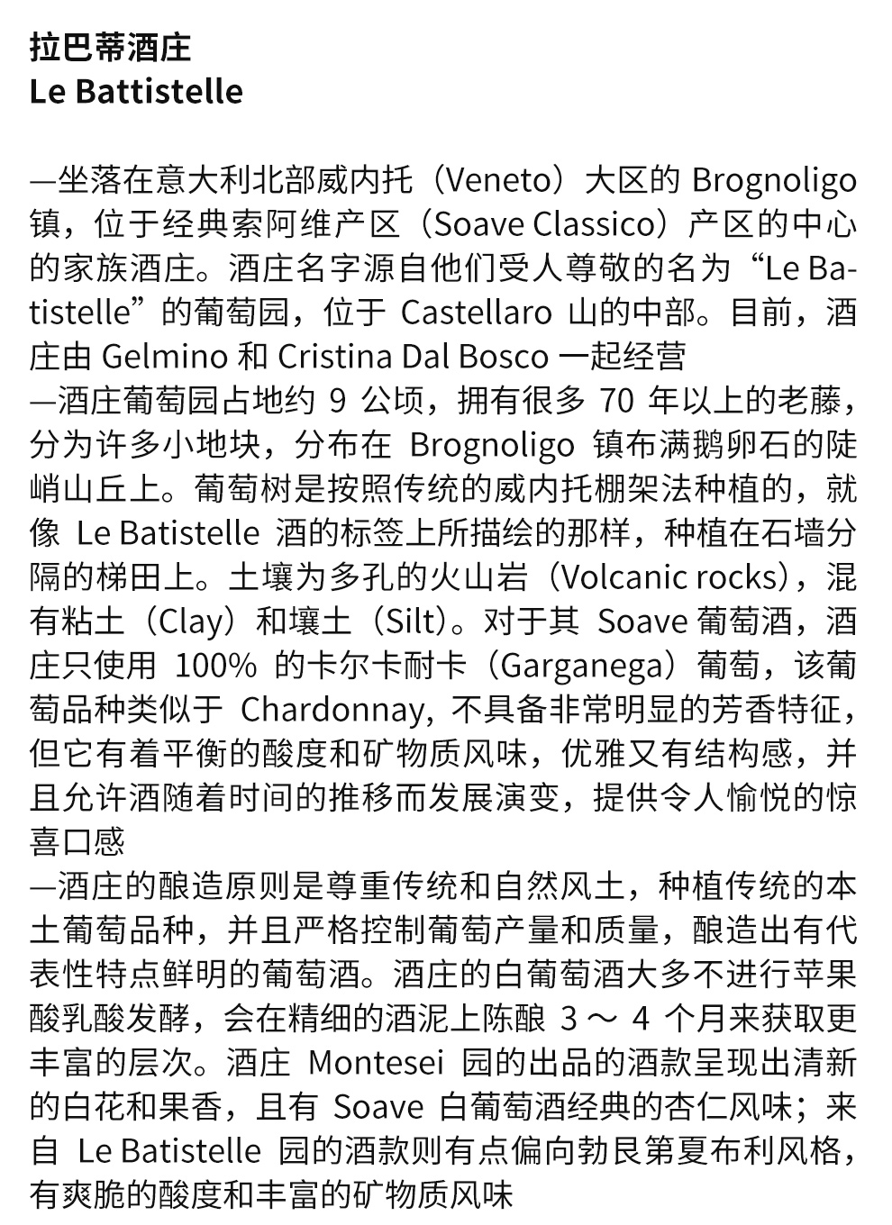 拉巴蒂酒庄(Le Battistelle)的葡萄园占地约9公顷,拥有很多70年以上的老藤,分为许多小地块,分布在Brognoligo镇布满鹅卵石的陡峭山丘上。葡萄树是按照传统的威内托棚架法种植的,就像Le Batistelle酒的标签上所描绘的那样,种植在石墙分隔的梯田上。土壤为多孔的火山岩(Volcanic rocks,),混有粘土(Clay)和壤土(Silt)。对于其索阿维葡萄酒,Le Battistelle酒庄只使用100%的卡尔卡耐卡(Garganega)葡萄,这个葡萄品种不具备非常明显的芳香特征,但它有平衡的酸度和矿物质风味,优雅又有结构感,并且允许酒随着时间的推移而发展演变,提供令人愉悦的惊喜口感,独特而不可复制。
