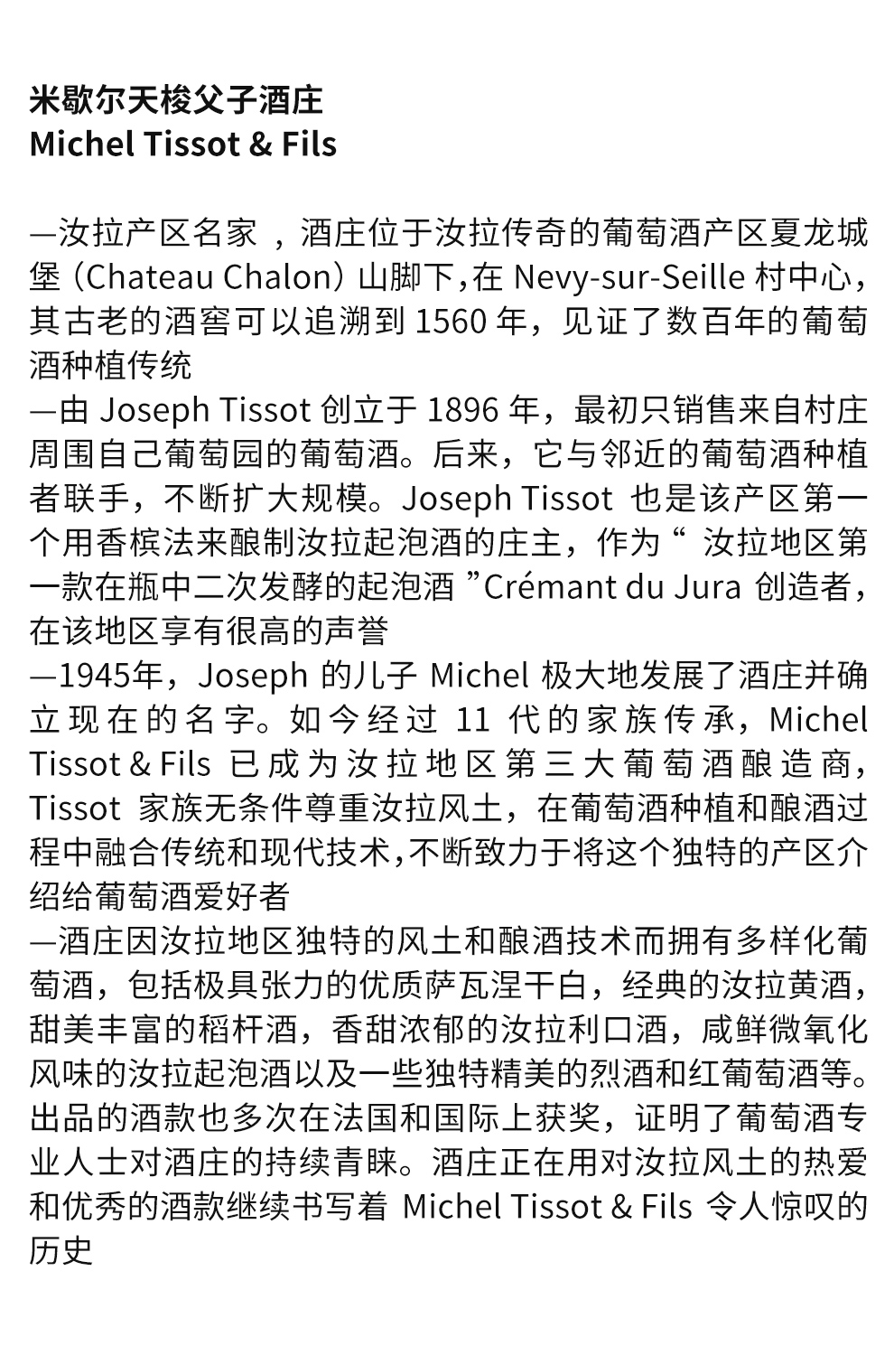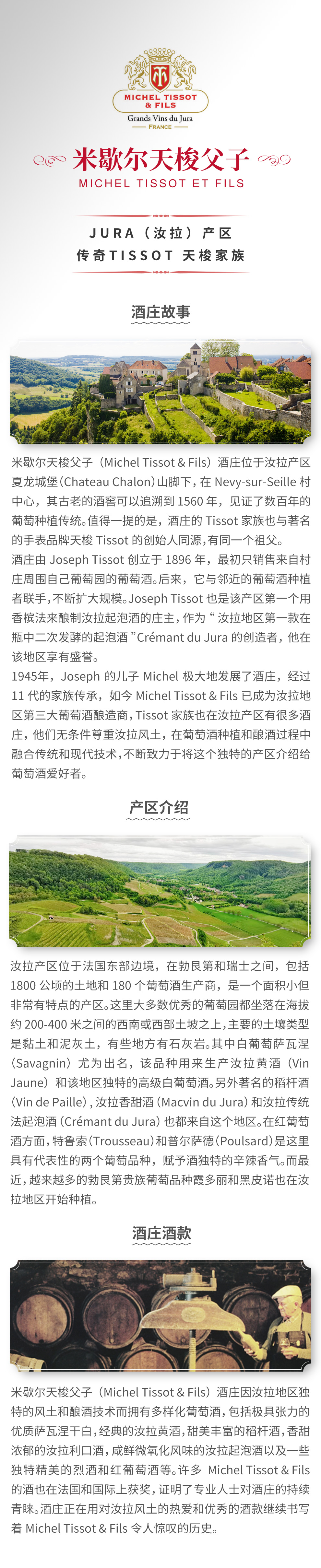 1945年,Joseph的儿子Michel极大地发展了酒庄并确立现在的名字。如今经过11代的家族传承,Michel Tissot & Fils已成为汝拉地区第三大葡萄酒酿造商,Tissot家族无条件尊重汝拉风土,在葡萄酒种植和酿酒过程中融合传统和现代技术,不断致力于将这个独特的产区介绍给葡萄酒爱好者。