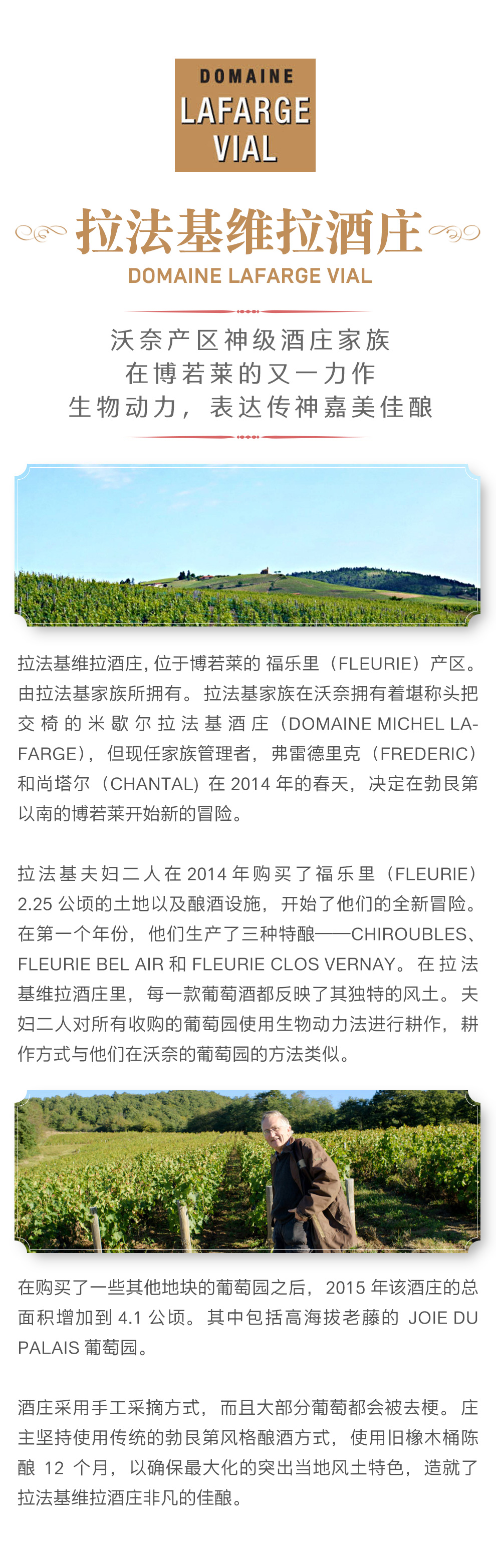 拉法基家族在沃奈拥有着堪称头把交椅的米歇尔拉法基酒庄(Domaine Michel Lafarge),但现任家族管理者,弗雷德里克(Frederic)和尚塔尔·拉法基(Chantal)在 2014 年的春天,决定在勃艮第以南的博若莱开始新的冒险。