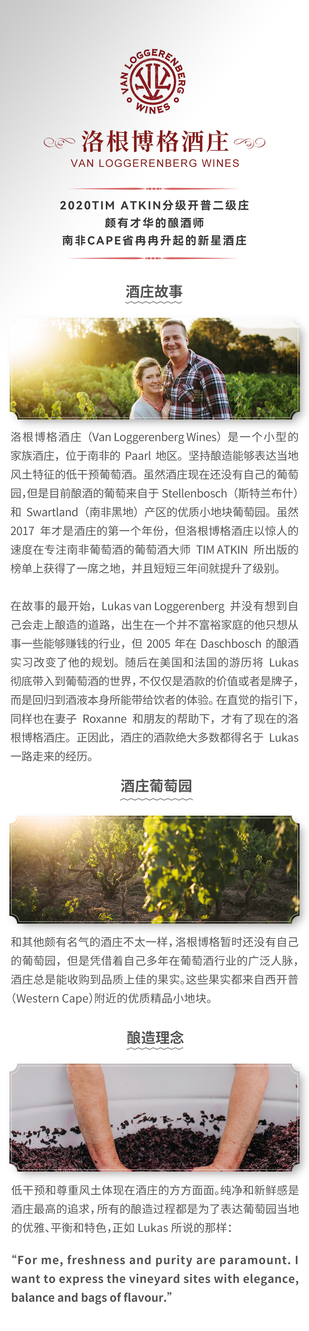 洛根博格酒庄(Van Loggerenberg Wines)是一个小型的家族酒庄,位于南非的Paarl地区。坚持酿造能够表达当地风土特征的低干预葡萄酒。虽然酒庄现在还没有自己的葡萄园,但是目前酿酒的葡萄来自于Stellenbosch(斯特兰布什)和Swartland(南非黑地)产区的优质小地块葡萄园。虽然2017年才是酒庄的第一个年份,但洛根博格酒庄以惊人的速度在专注南非葡萄酒的葡萄酒大师TIM ATKIN所出版的榜单上获得了一席之地,并且短短三年间就提升了级别。