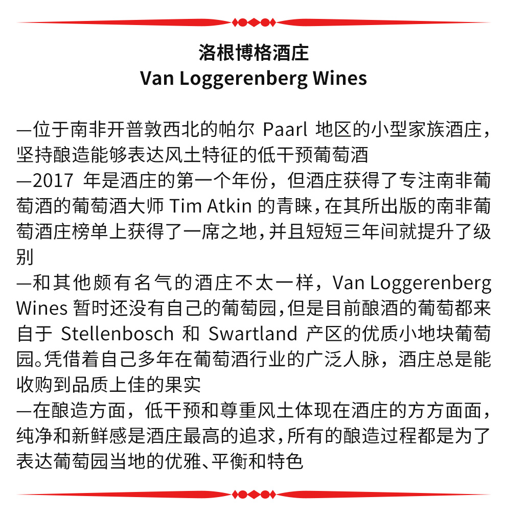 酒庄扎根帕尔(Paarl)产区,精选斯泰伦布什与黑地产区的优质老藤葡萄,以白诗南、品丽珠、神索为核心品种,坚持‘零添加酵母’的纯粹酿造。每一瓶都是开普风土的诗歌。想体验南非新浪潮的极致纯净?洛根博格的红白佳酿,正等你来‘打破刻板印象’!"