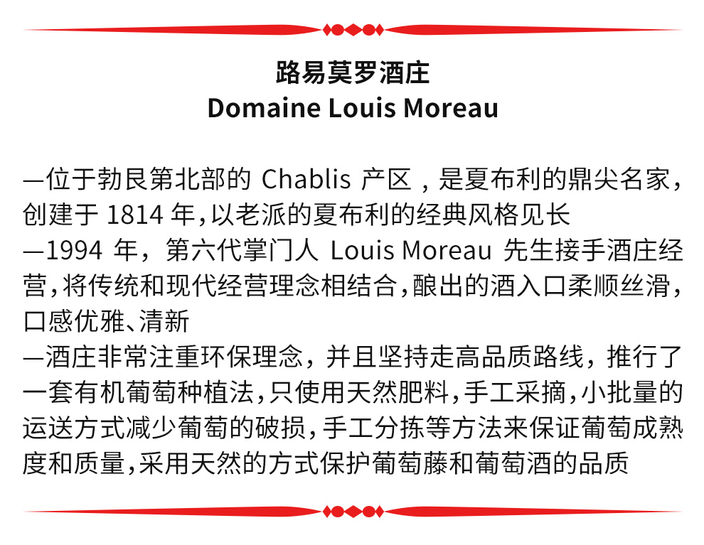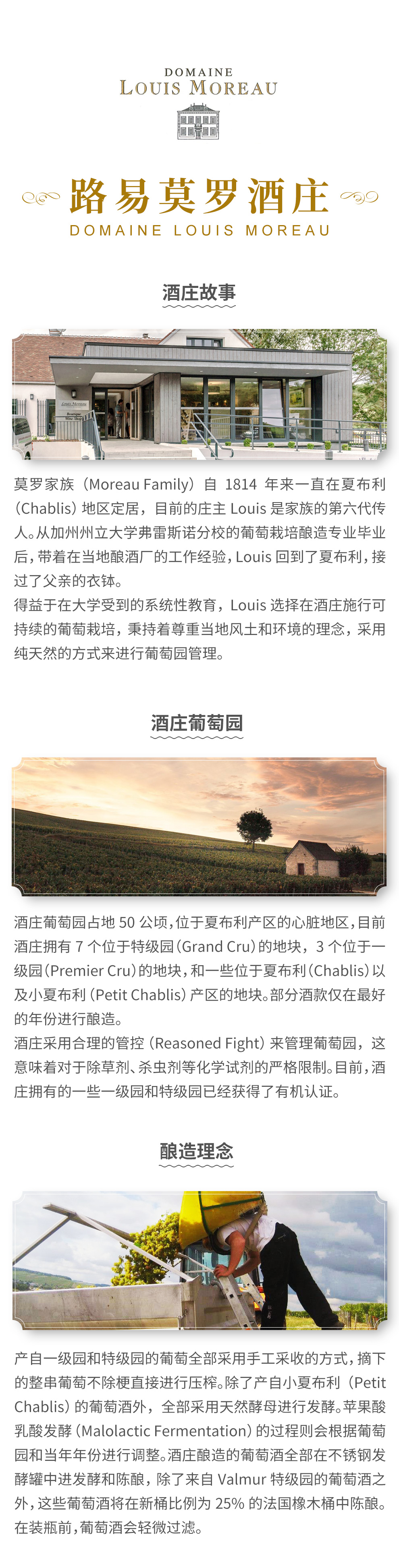莫罗家族(Moreau Family)自1814年来一直在夏布利(Chablis)地区定居,目前的庄主Louis是家族的第六代传人。从加州州立大学弗雷斯诺分校的葡萄栽培酿造专业毕业后,带着在当地酿酒厂的工作经验,Louis回到了夏布利,接过了父亲的衣钵。