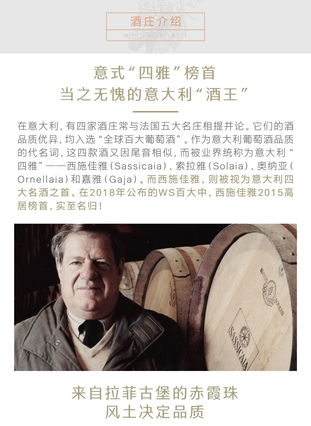 在意大利,有四家酒庄常被与法国五大名庄相提并论。它们的酒品质优异,均入选“全球百大葡萄酒”。作为意大利最顶级酒的代名词,又恰巧尾音相同,因此被业界统称为意大利四大“雅”——西施佳雅、索拉雅、奥纳亚和嘉雅(Sassicaia,Solaia,Ornellaia,Gaja)。而西施佳雅,则被视为意大利四大名酒之首!