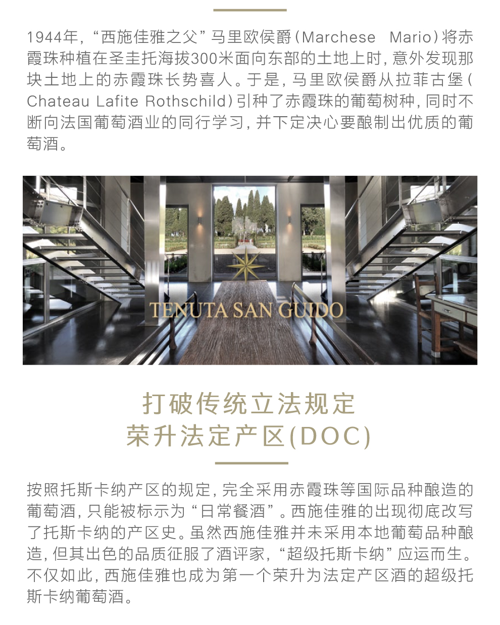 这四款葡萄酒风格都有别于传统的托斯卡纳葡萄酒,且深受人们的认同和喜爱。它们的诞生不仅催生了“超级托斯卡纳”这一概念,而且还让繁复的意大利葡萄酒分级制度显得更加迂腐可笑。后来,意大利葡萄酒协会不得不作出妥协,增设优秀地区葡萄酒级别(IGT),即托斯卡纳IGT。还把一些强势酒款也纳入DOC级别之列。作为托斯卡纳传统的反叛者西施佳雅正体现出托斯卡纳地区两种不同酿造理念之间的抗衡。西施佳雅的酿造虽然没有遵循意大利分级制度的规定,但它却拥有让世人惊叹的高品质,连原来苛刻的分级制度也不得不为之作出调整,破格提升其为保格利产区DOC级葡萄酒。