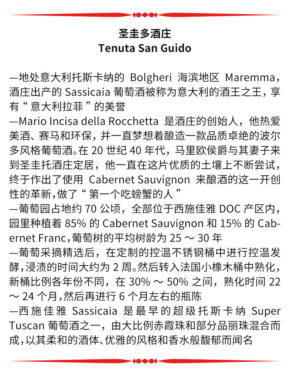 在1967年正式生效的经典基安帝产区法(Chianti Classico DOCG)规定中,桑娇维塞(Sangiovese)在混酿中的最高比例为70%,其余30%只能是本土葡萄品种,包括白葡萄品种在内。上世纪60年代末至70年代,“超级托斯卡纳”的出现给向来传统的托斯卡纳葡萄酒造成了极大的冲击。1968年,西施佳雅(Sassicaia)面世了,它只采用赤霞珠(Cabernet Sauvignon)和品丽珠(Cabernet Franc)进行混酿,完全把桑娇维塞剔除了。它虽产自1965年,但直到1968年才发售,品质优秀,但由于酿造葡萄的原因,只能归为日常餐酒(VDT)之列。此款西施佳雅的诞生无疑是石破天惊的大事件,既给基于桑娇维塞的葡萄酒以沉重的一击,也给意大利葡萄酒DOC法规一记响亮的耳光。然而,正是这款西施佳雅的诞生给安东尼世家(Antinori)其他家族成员们以启发,推出了一款葡萄酒——索拉雅(Solaia)。这款酒于1978年首次酿成,,采用75%赤霞珠(Cabernet Sauvignon)、5%品丽珠(Cabernet Franc)和20%桑娇维赛(Sangiovese)混酿而成。