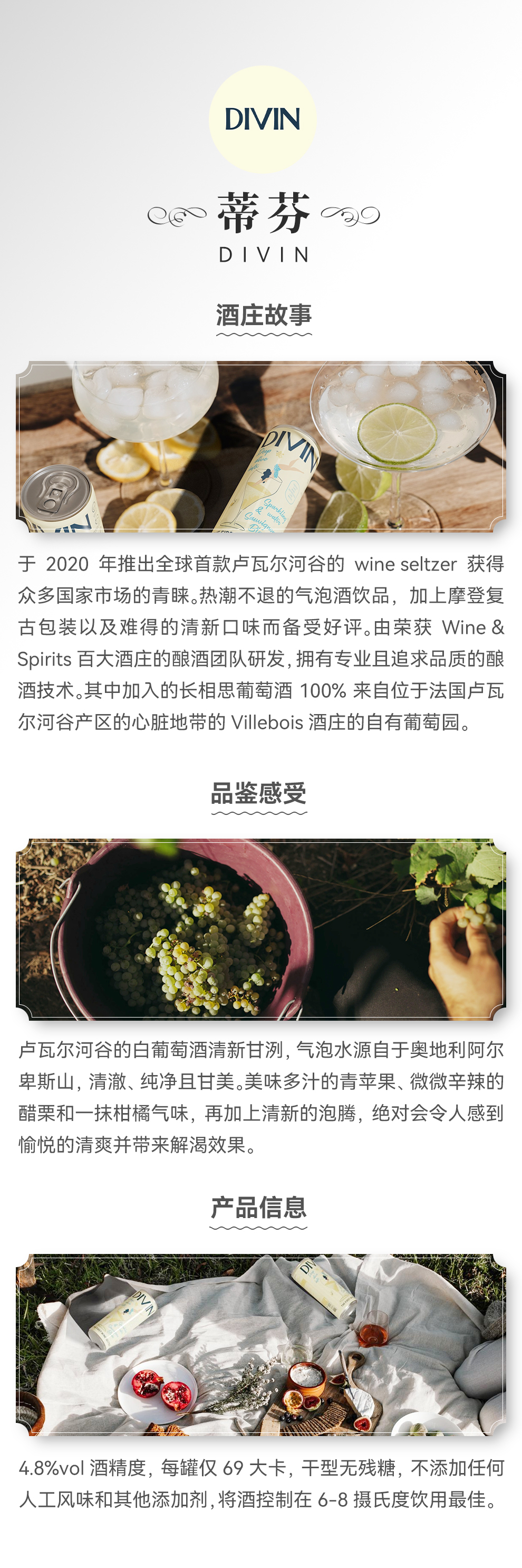 于2020年推出全球首款卢瓦尔河谷的wine seltzer获得众多国家市场的青睐。热潮不退的气泡酒饮品,加上摩登复古包装以及难得的清新口味而备受好评。由荣获Wine & Spirits百大酒庄的酿酒团队研发,拥有专业且追求品质的酿酒技术。其中加入的长相思葡萄酒100%来自位于法国卢瓦尔河谷产区的心脏地带的Villebois酒庄的自有葡萄园。
