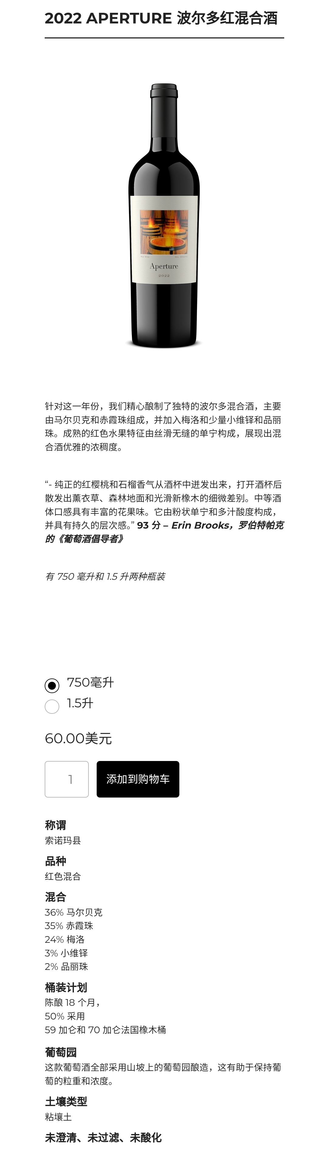 • 产品名称:Aperture光影酒庄混酿红葡萄酒,索诺玛,750ml