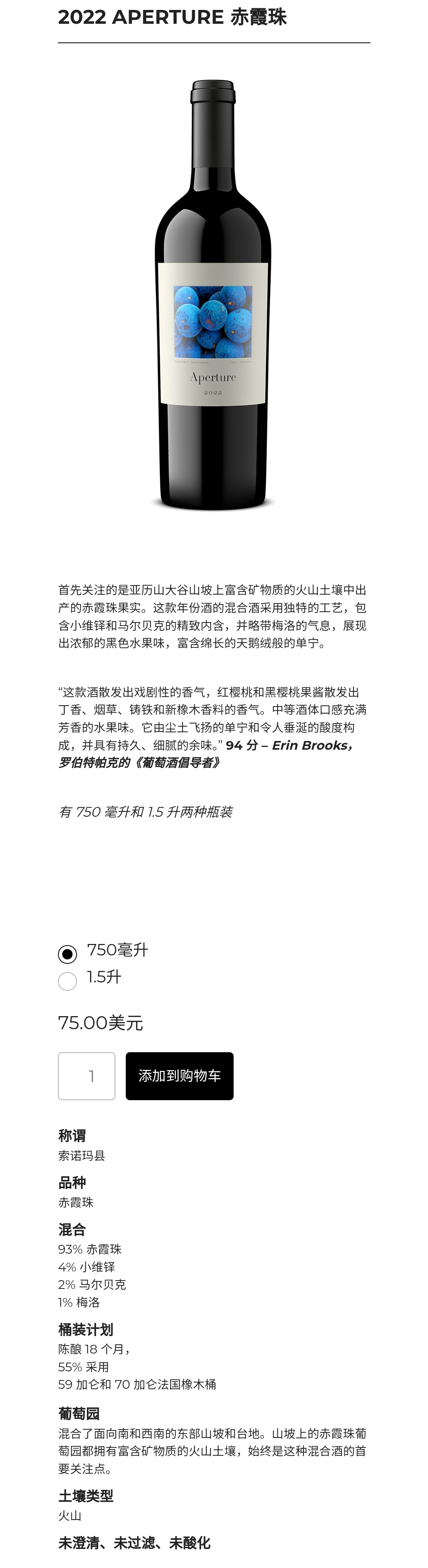 • 产品名称:Aperture光影酒庄赤霞珠,索诺玛,750ml