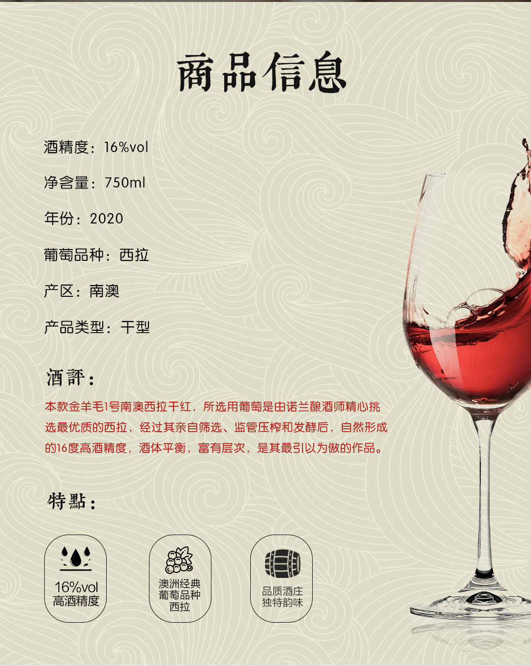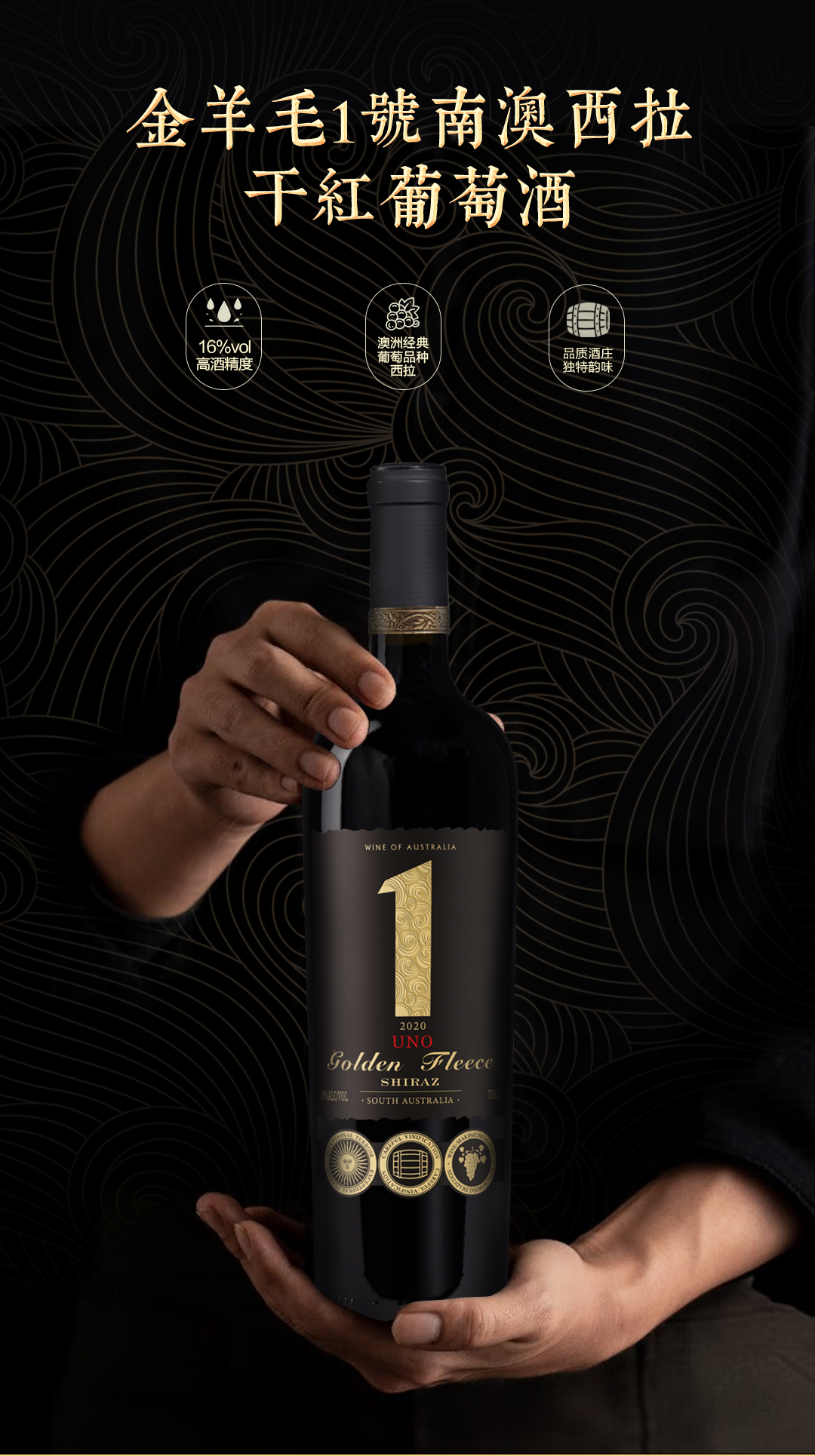 6只精美横放彩箱、重瓶手握分量感、金属环品种的象征、16%高酒精度独特风味、诺兰酿酒师倾力酿造澳洲国宝葡萄西拉