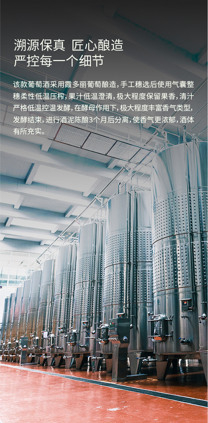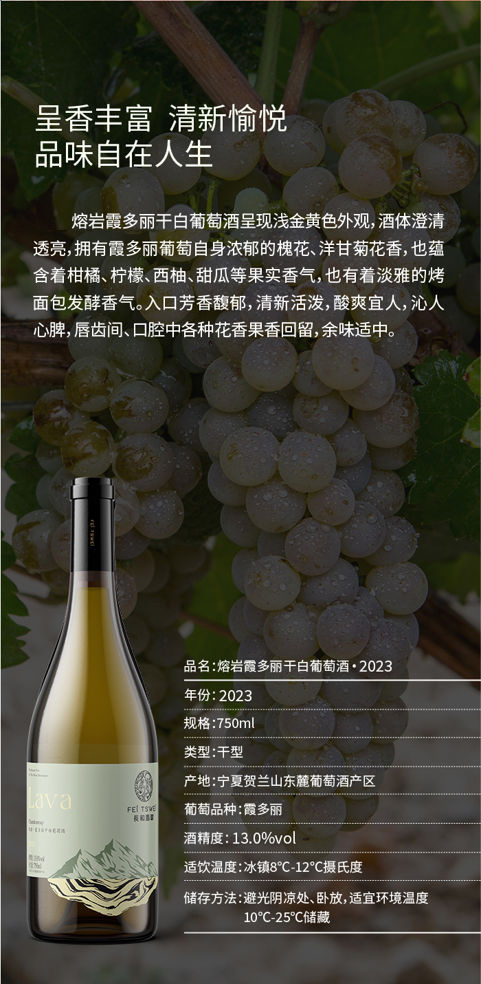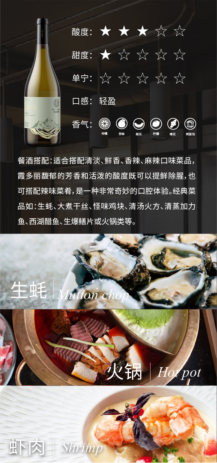 酒体呈新鲜的禾杆绿,果香馥郁芬芳,具有玫瑰、柑橘、甜瓜、柚子、黄桃的香气,入口芳香四溢,饱满、清爽、活泼的酸度提升了此款酒的层次感和悠长度。