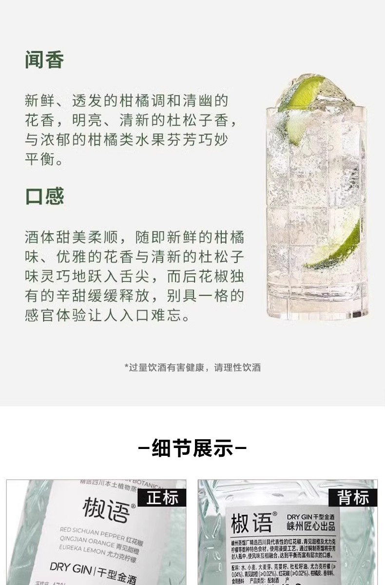 一般贸易 品牌商户 崃州椒语干型金酒700ml洋酒烈酒可调金汤力酒基酒长岛冰茶鸡尾酒