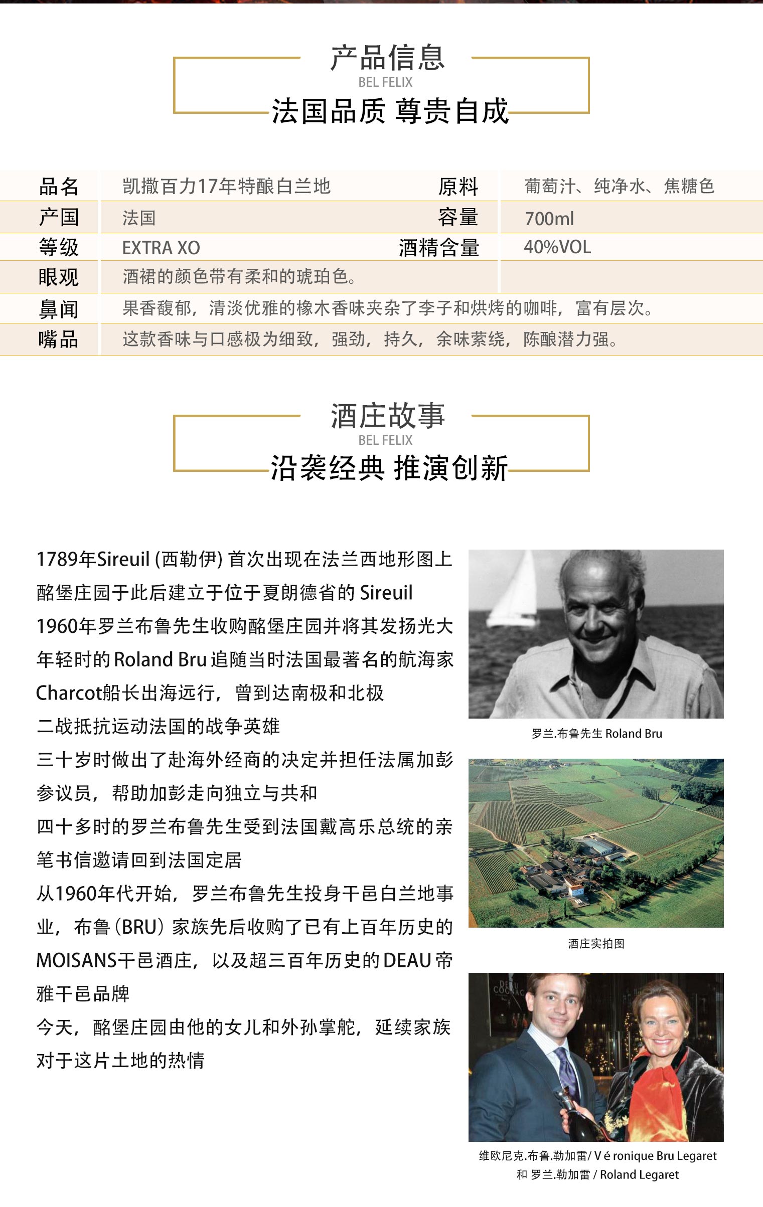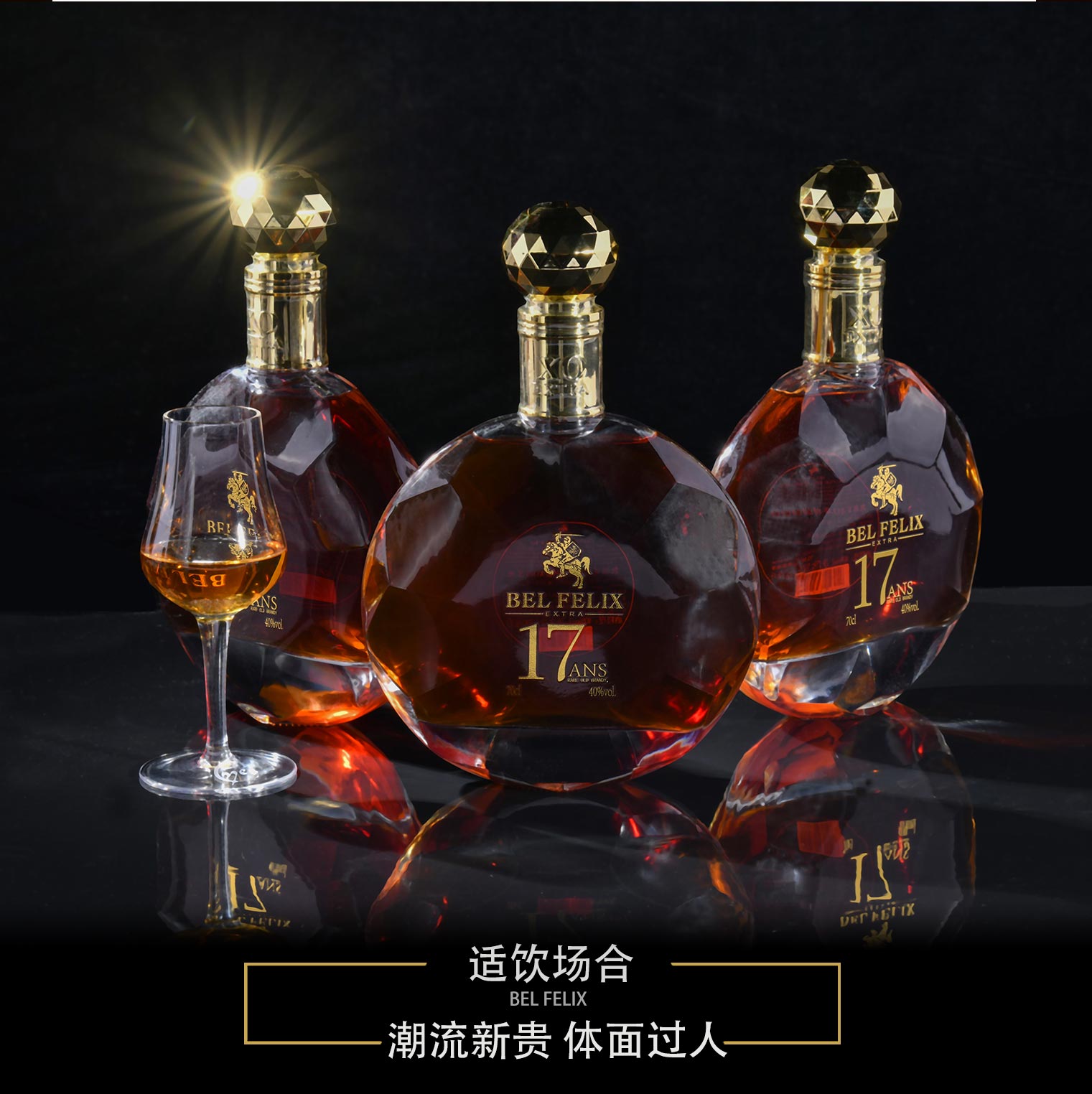 传承祖先流传的蒸馏工艺,由酒窖大师精心 挑选的17年老自兰地酒液调配,经过两次 馏在橡木桶中慢慢陈年而成,是世界上最好 的自兰地之一。