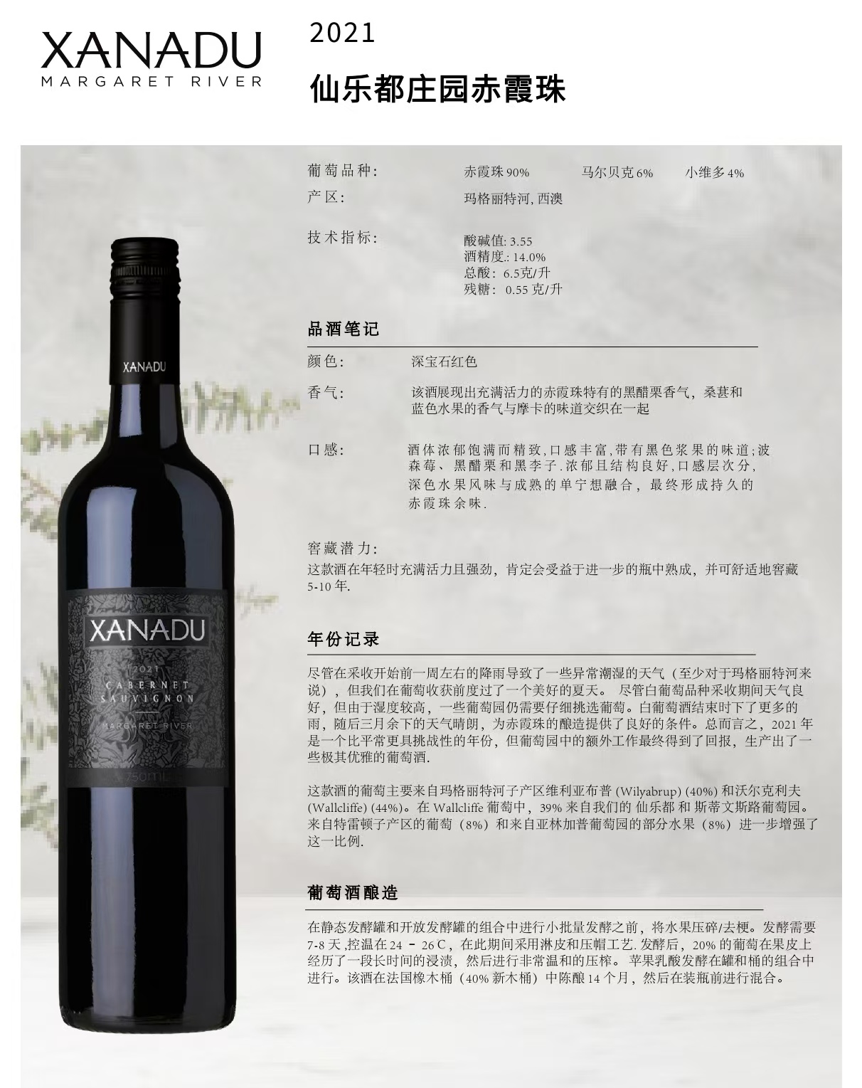 一般贸易 品牌商户 仙乐都庄园赤霞珠干红葡萄酒   XW Xanadu Cab Sauv