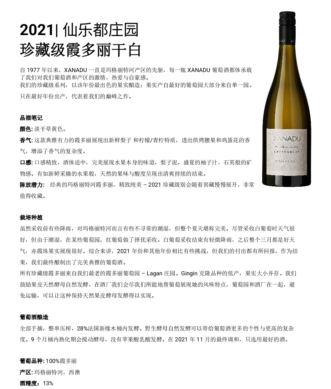 • 产品名称:仙乐都珍藏霞多丽干白葡萄酒