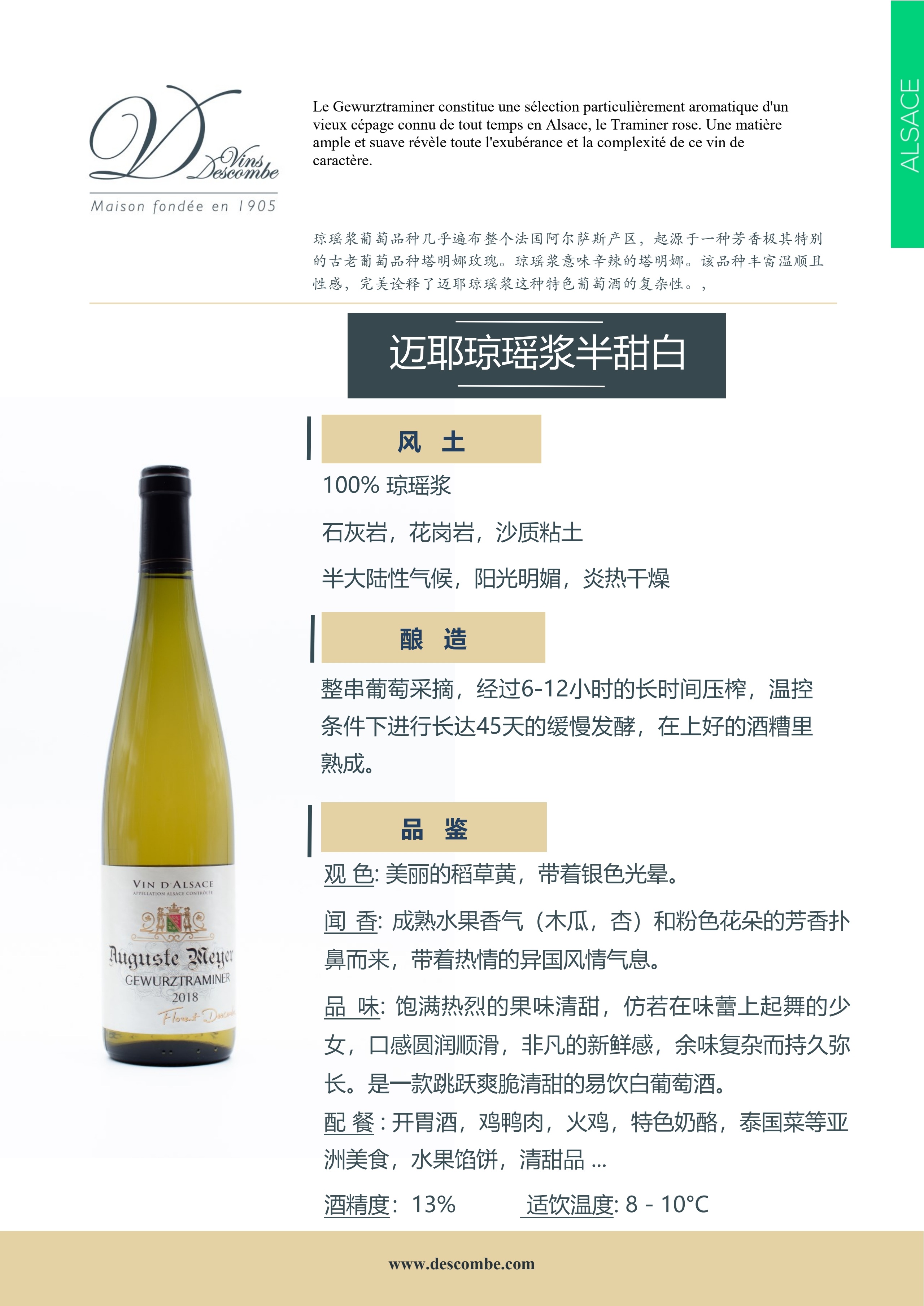 • 外文名称:AUGUSTE MEYER, GEWURZTRAMINER, AOP ALSACE