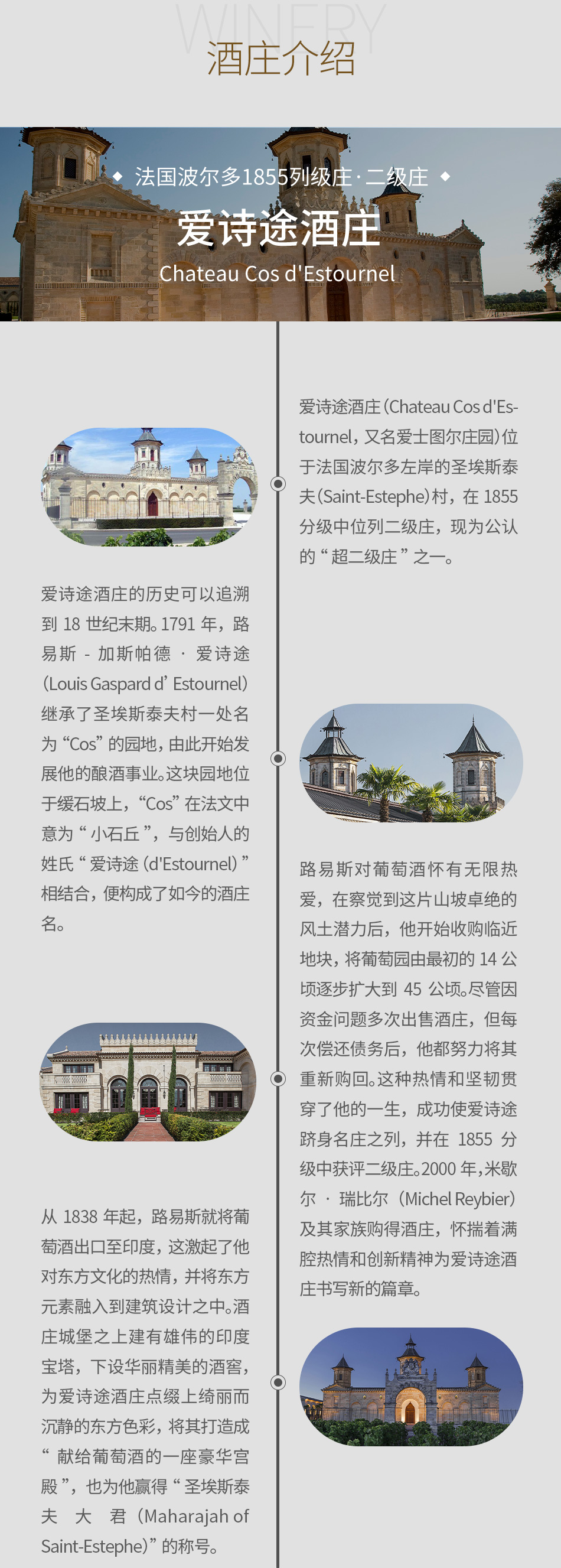 爱诗途庄园闻名遐迩的城堡建筑同样出自创始人路易斯之手。对东方文化涉猎颇深且十分喜爱的路易斯别出心裁地将众多东方元素融合进酒庄城堡的设计中。他在酒庄城堡之上建造了雄伟的印度宝塔,宝塔之下则为华丽精美的酒窖,为爱诗途庄园点缀上绮丽而沉静的东方色彩。此外,他还特意从桑给巴尔(Zanzibar)运回一道苏丹宫殿大门,并在城堡各处雕刻上象征着智慧的印度大象,将酒庄打造成“献给葡萄酒的一座豪华宫殿”,路易斯本人也因此被人们称为“圣埃斯泰夫大君(Maharajah of Saint-Estephe)”。如今,爱诗途这座独具东方古韵的城堡已成为波尔多最热门的景点之一。