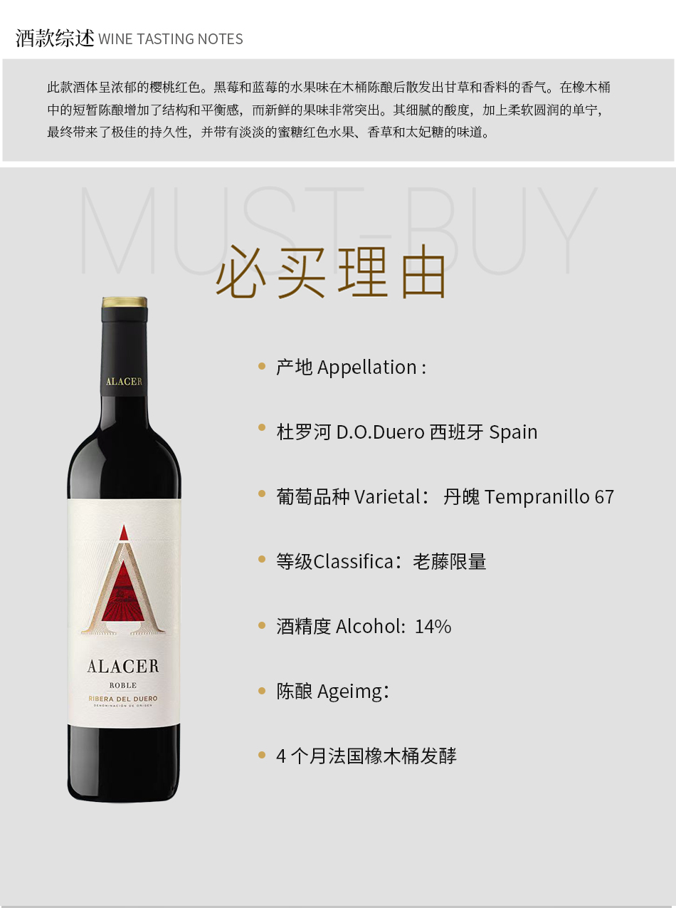 4 个月法国橡木桶发酵 黑莓和蓝莓的水果味在木桶陈酿后散发出甘草和香料的香气。
