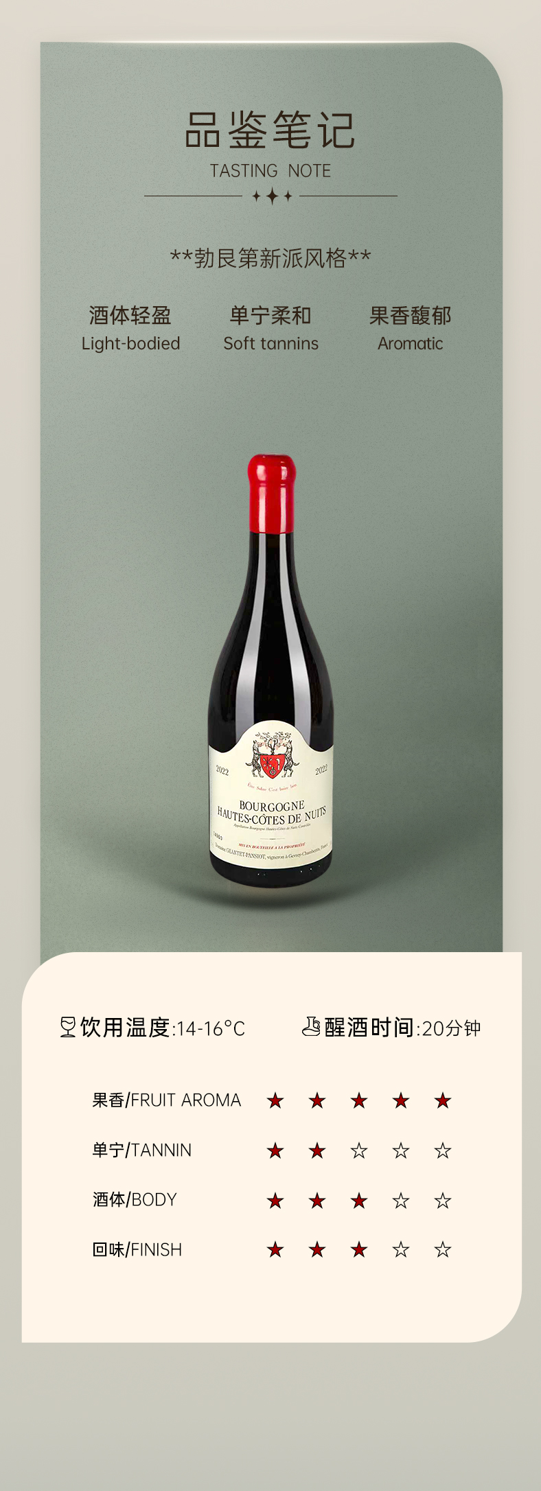 Domaine Geantet Pansiot的葡萄酒年复一年精准地给我们展现着哲伏香贝丹的典型风格——浓墨重彩、强劲伟岸,同时完美呈现黑皮诺的丝滑精致,带给让消费者惊叹并且美妙的舌尖欢愉。