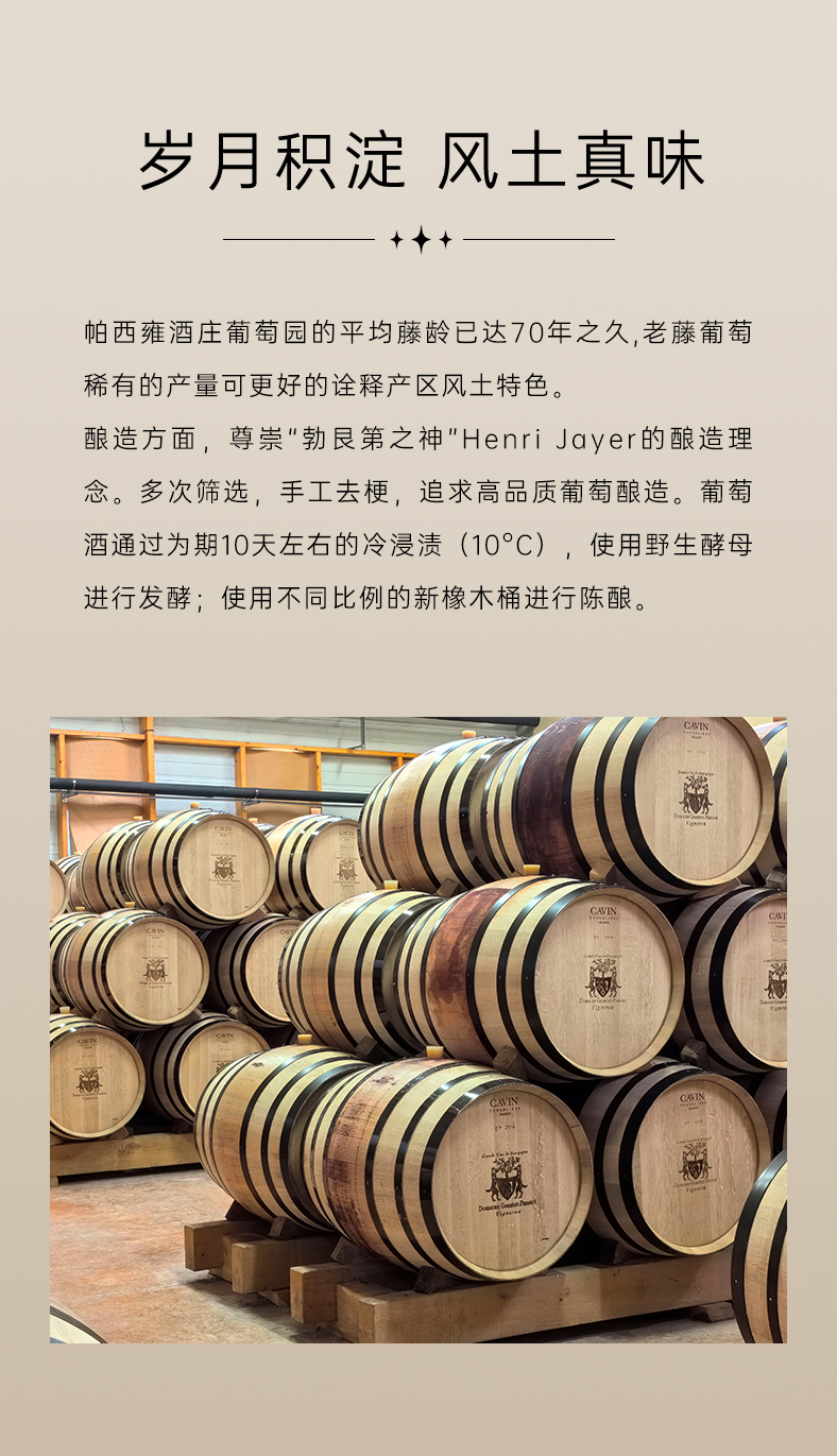 此外,葡萄园中有长达70 年之久的老藤已然成为了帕西雍家族的瑰宝,目前大部分老藤如今依然存活,且未经嫁接,非常难得。产出的酒复杂精致,单宁细腻,年轻时就十分易饮,并且拥有很强的陈年能力。
