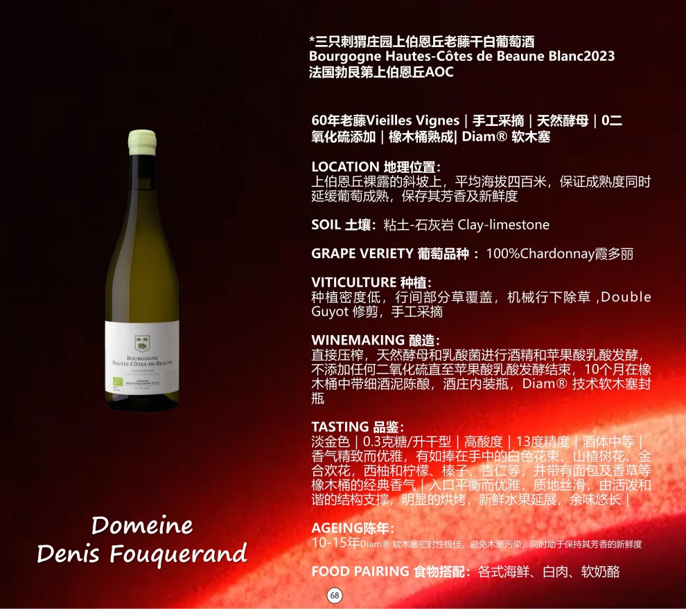 • 外文名称:DOMAINE DENIS FOUQUERAND ET FILS AOC BOURGOGNE HAUTES COTES DE BEAUNE BLANC 2023