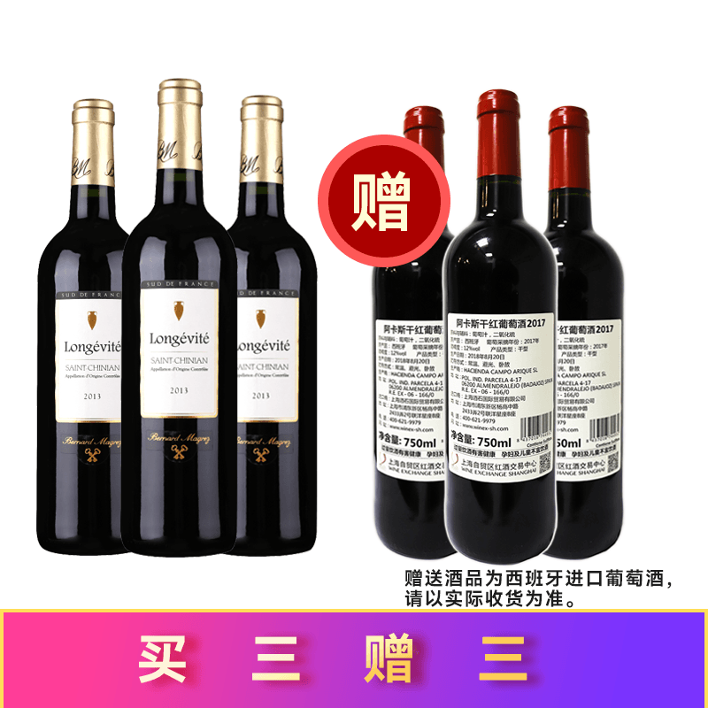 【买三赠三】兰奇干红葡萄酒2013*3瓶,再赠3瓶西班牙进口葡萄酒