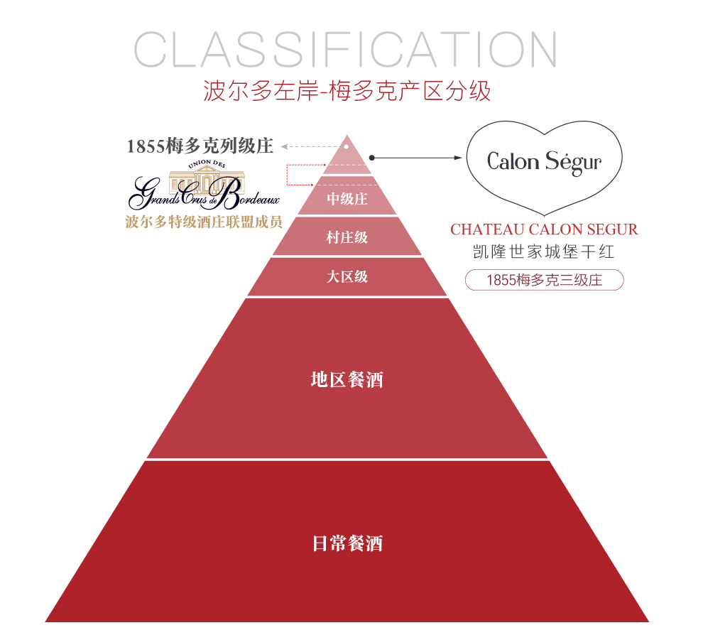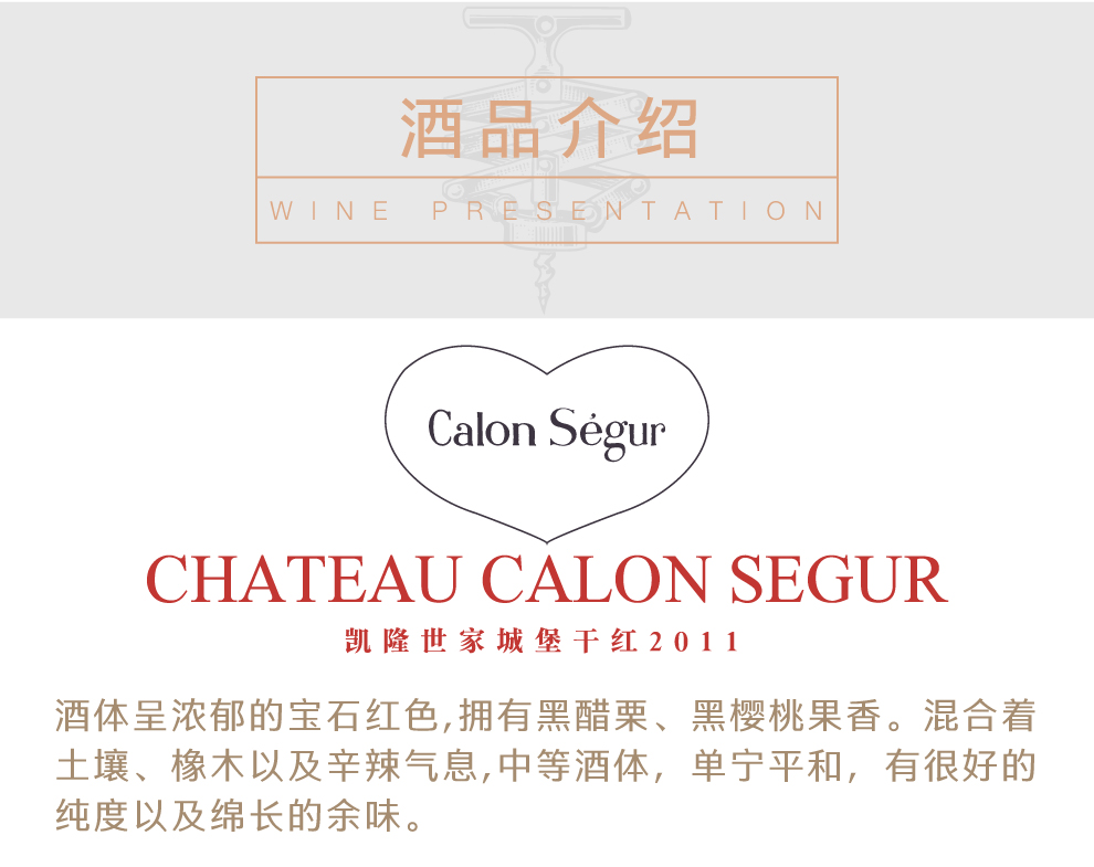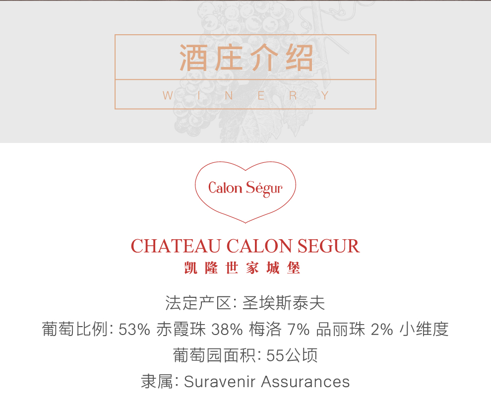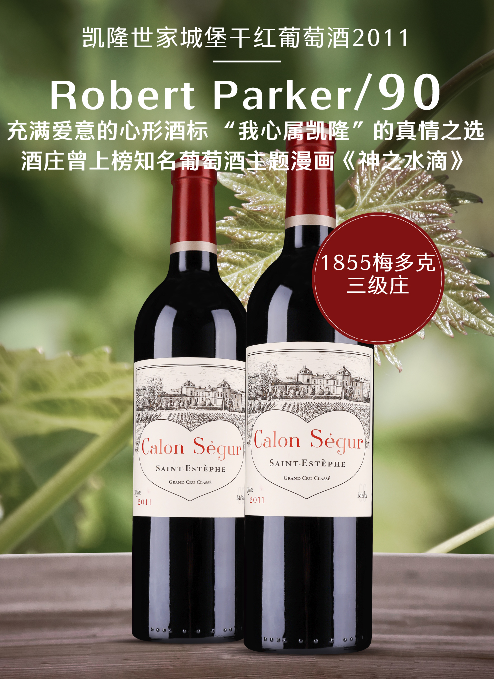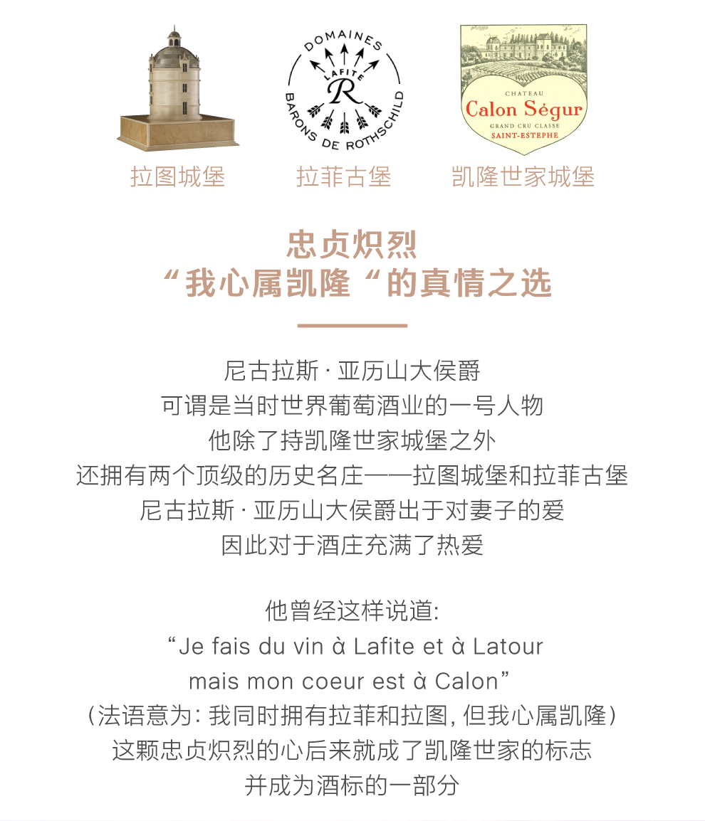 十八世纪时,身为波尔多议会主席的尼古拉斯·亚历山大侯爵 已经拥有了拉菲和拉图两大酒庄,后来他娶了寡妇Mme de Gasq, 同时也拥有了她的嫁妆凯隆酒庄,后来他将自己的姓氏(Segur)加到了酒庄名中,于是就成了今天的凯隆世家(Chateau Calon Segur). 他对凯隆世家的爱其实是出于对妻子的爱,他曾经这样说道“ Je fais du vin à Lafite et à Latour, mais mon cœur est à Calon ”(法语意为:我同时拥有拉菲和拉图,但我的心在凯隆。)这颗忠贞炽烈的心后来就成了凯隆世家的标志,并成为酒标的一部分。