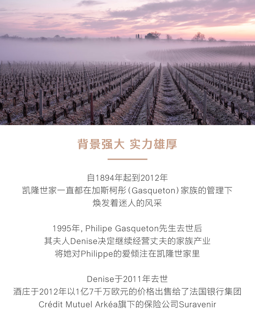 凯隆世家酒庄自1894年起为Capbern Gasqueton家族所有,丈夫在1995年过世后,Denise勇敢地决定继续经营亡夫的家族产业,将她对Philippe的爱倾注在他生前最在意也最花时间精力的凯隆世家里。
